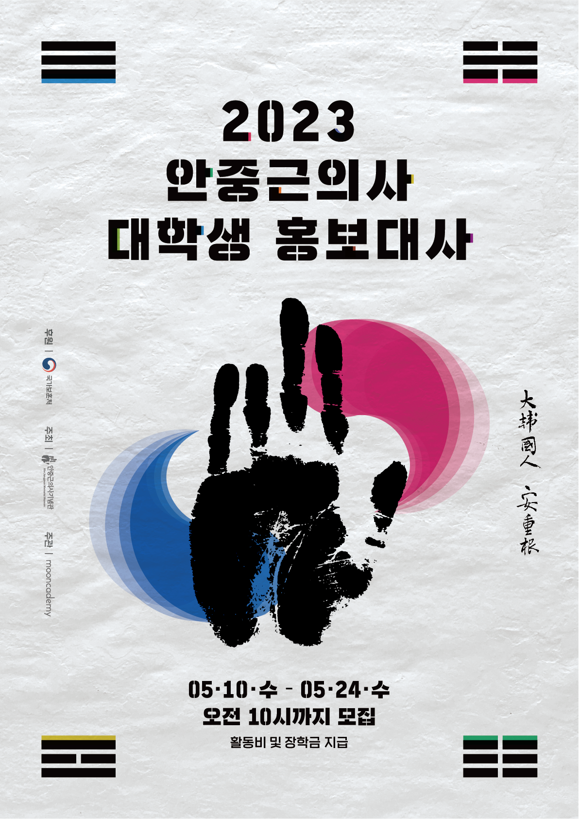 1. 2023 안중근의사 대학생 홍보대사 개요 ① 모집대상 - 국내 대학(원)에서 학업 중인 학생 - 32명 예정 (4명 기준으로 조 구성 / 총 8조) - 개인 1인 혹은 조 단위 (2-4인↑) 지원 가능