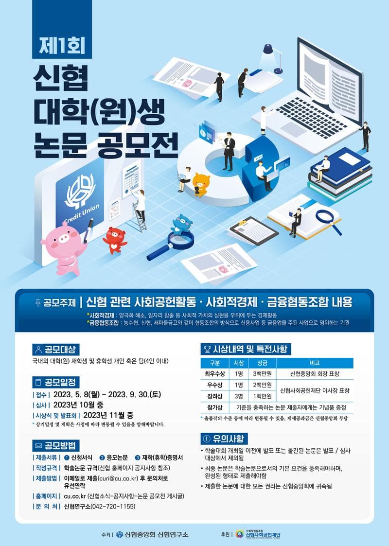 제1회 신협 대학(원)생 논문 공모전 ○ 공모주제 - 신협 관련 사회공헌활동 · 사회적경제 · 금융협동조합 내용 *사회적경제: 양극화 해소, 일자리 창출 등 사회적 가치의 실현을 우위에 두는 경제활동 *금융협동조합: 농수협, 신협, 새마을금고와 같이 협동조합의 방식으로 신용사업 등 금융업을 주된 사업으로 영위하는 기관 ○ 공모일정 - 접수기간 : 2023년 5월 8일 \~ 9월 30일 - 심사기간 : 2023년 10월 중 - 결과발표 : 2023년 11월 중 (신협 홈페이지 공지 및 개별연락) - 시 상 식 : 2023년 11월 중 (개별연락 예정) ※ 상기 일정은 주최측 상황에 따라 변경될 수 있습니다. ○ 지원자격 - 국내·외 대학(원) 재·휴학생(전공무관) - 개인 또는 팀(4인 이내) 참가 * 팀 단위 참가는 팀원 모두 자격 요건을 갖추어야 함 ○ 접수방법 - 첨부의 참가신청서와 원고를 이메일( 이메일 접수처: curi@cu.co.kr )로 제출 - 이메일 접수 후 문의처로 유선연락 ○ 제출서류 - 1. 참가신청서 - 2. 개인정보수집·이용·제공동의서 * 스캔 또는 사진촬영 후 파일전송 * 팀 단위 참가는 팀원 모두 작성하여 제출 - 3. 논문파일 * 첨부의 원고작성 기준을 준수하여 제출 - 4. 재(휴)학증명서 1부 * 스캔 또는 사진촬영 후 파일전송 * 팀 단위 참가는 팀원 개인별 1부 * 2023년 3월 1일 \~ 2023년 9월 30일 사이에 발급된 서류에 한함 ○ 시상내역
