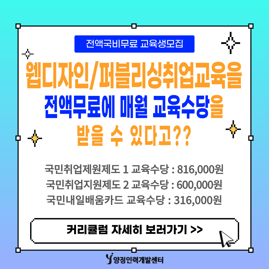 ● 기간 및 일정 - 교육 기간 : 8월 23일 \~ 1월 25일\, 평일반(09:00\~17:30) ● 활동혜택 - 교육비 전액 국비무료지원 - 교육수당 최대 81.6만원 제공 * 국민취업지원제도 1유형 : 81.6만원 * 국민취업지원제도 2유형 : 60만원 * 국민내일배움카드 참가자 : 31.6만원 - 전 교재 및 학습자료 무상제공 - 이력서클리닉 & 자소서 개별 첨삭지원
