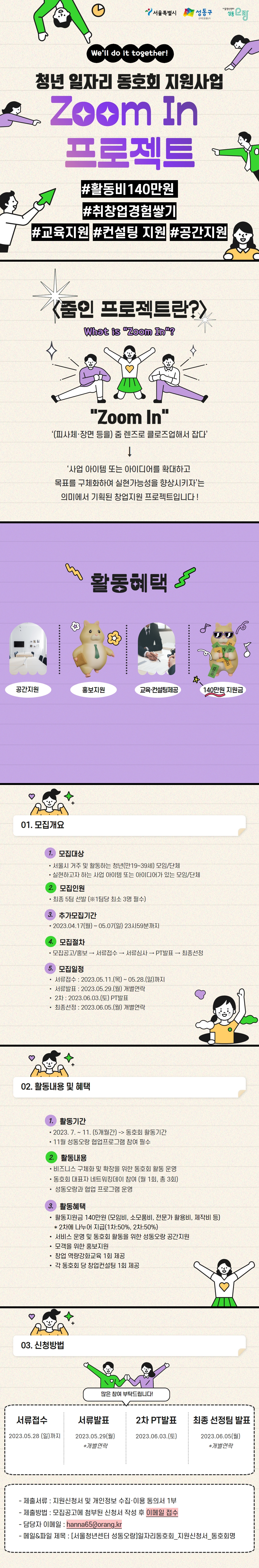 모집 공고 내용 ‘각자 가지고 있는 창업 아이템 또는 아이디어의 목표를 확대하고 구체화하여 실현가능성을 향상시키자’는 의미의 창업지원 프로젝트입니다. 사업 아이템 개발 및 실현과 아이디어를 구체화할 수 있도록 지원하는 프로그램으로, 창업에 도전하고자 하는 예비창업 청년들에게 140만원의 활동비지원과 교육지원 및 컨설팅 지원을 통해 창업도전 기회를 제공하고자 합니다. ---------------------------------------------------------------- ○ 5개월의 기간 동안 140만원의 활동비와 동호회 간 교류기회 제공 - 동호회의 목표 및 미션을 달성하기 위해 자율 활동을 진행하면 됩니다. - 월 1회, 총 3회의 동호회 간 교류(네트워킹데이)를 통해 정보공유의 시간을 가져볼 수 있습니다. ○ 성동오랑과 협업하여 비즈니스를 실행해보는 기회 제공 - 성동오랑을 이용하는 청년들에게 여러분의 비즈니스를 실현해보며 다양한 가치가 제공될수 있도록 프로그램을 운영해봅니다. 평소 실현하고 싶고 구체화하고 싶었던 사업 아이템 또는 아이디어가 있었다면 망설이지 말고 참여해보세요!✨ ---------------------------------------------------------------- ◇ 모집개요 -모집대상 • 서울시 거주 및 활동하는 청년(만19\~39세) 모임/단체(※1팀당 최소 3명 필수) • 실현하고자 하는 사업 아이템 또는 아이디어가 있는 모임/단체 -모집인원 : 최종 5팀 선발(※1팀당 최소 3명 필수) -모집기간 : 2023.05.11.(목)\~05.28.(일) -모집절차 : 모집공고/홍보 → 서류접수 → 서류심사 → PT발표 → 최종선정 -모집일정 • 1차 서류접수 : 2023.04.17.(월) \~ 05.07.(일) 23:59까지 • 1차 서류발표 : 2023.05.10.(일) 개별연락 • 2차 : 2023.05.20.(토) PT발표 • 최종선정 : 2023.05.22.(월) 개별연락 • 동호회OT 및 교육 : 2023.05.26.(금) => 필수참석 ◇ 활동내용 및 혜택 -활동기간 : 2023.07.\~11.(5개월간) => 동호회 활동기간 *11월 성동오랑 협업프로그램 참여 필수 -활동내용 • 비즈니스 구체화 및 확장을 위한 동호회 활동 운영 • 동호회 대표자 네트워킹 데이 참여(월1회, 총 3회) • 성동오랑과 협업 프로그램 운영 -활동혜택 • 활동지원금 140만원(모임비, 소모품비, 전문가 활용비, 제작비 등) √ 2차에 나눠 지급 -1차 50% (700,000원) -2차 50% (700,000원) • 서비스 운영 및 동호회 활동을 위한 성동오랑 공간지원 • 모객을 위한 홍보지원 • 창업 역량강화교육 1회 제공 • 각 동호회 당 창업컨설팅 1회 제공 ◇신청방법 -서류접수 : 2023.05.11.(목) \~ 05.28.(일)까지 -제출서류 : 지원신청서 및 개인정보 수집·이용 동의서 1부 -제출방법 : 모집공고에 첨부된 신청서 작성 후 이메일 접수 -담당자 이메일 : hanna65@orang,kr -메일&파일 제목 : [서울청년센터 성동오랑]일자리동호회_지원신청서_동호회명 자세한 정보 : https://youth.seoul.go.kr/site/main/youth/politics/user/detail/33002