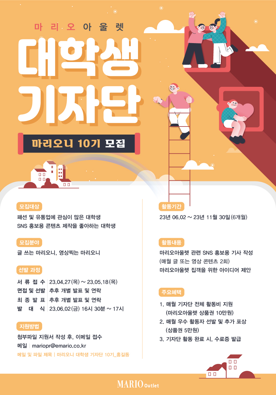 ▶주최사 / 활동명 마리오아울렛 / 마리오니 10기 ▶활동내용 마리오아울렛 관련 SNS 홍보용 기사 작성 (매월 글 또는 영상 콘텐츠 2회 이상) 마리오아울렛 매장 집객을 위한 아이디어 제안 (활동 기간 중 1회) ▶모집 기간 23.04.27(목) \~ 23.05.18(목) ▶모집 인원 0명 글쓰는 마리오니, 영상찍는 마리오니 ▶모집 대상 대학생 누구나 (휴학생도 가능) ▶참가 비용 유/무 무 ▶우대 사항 패션 및 유통업에 관심이 많은 대학생 SNS 홍보용 콘텐츠 제작을 좋아하는 대학생 ▶활동 지역 마리오아울렛 1, 2, 3관 (서울시 금천구 / 가산디지털단지역 인근) ▶활동 기간 23.06.02 \~ 23.11.30 (총 6개월) ▶활동 혜택 1) 매월 기자단 전체 활동비 지원 2) 매월 우수 활동자 선발 및 추가 포상 3) 기자단 활동 완료 시, 수료증 발급 ▶오프라인 모임 횟수 발대식/수료식만 오프라인 참석. 이 외에는 온라인으로 미션 전달 예정 ▶지원하는 방법 첨부파일 지원서 작성 후, 이메일 접수 - 이메일: mariopr@emario.co.kr - 메일 및 파일 제목: 지원서_마리오니 대학생 기자단 10기_ ○ ○ ○