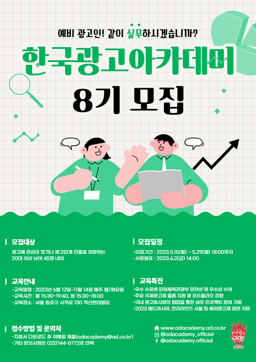 ■ 모집대상 : 광고에 관심이 있거나 광고업계 진출을 희망하는 20대 이상 남녀 45명 내외 약 5개월(6\~11월)의 교육기간동안 지속적인 수강이 가능한 자 ■ 모집일정 - 지원서 접수기간 : 2023년 5월 15일(월)\~29일(월) 18:00까지 - 서류심사 결과발표 : 2023년 6월 2일(금) 14:00 개별연락 - 면접심사 : 2023년 6월 5일(월), 7일(수) - 최종합격자 발표 : 2023년 6월 8일(목) 14:00 개별연락 ※ 선발 절차 : 1차 서류전형>2차 면접전형>최종합격자 발표 ■ 지원방법 : 참가 지원서 작성 및 메일 신청 - 접수 메일 : adacademy@ad.co.kr ※ 지원서는 우측 상단 첨부파일을 다운받으시면 됩니다. ■ 수강료 : 무료 ■ 교육운영(정규과정 8기) - 교육일정 : 2023년 6월 12일(월) \~ 11월 14일(화) 매주 월/화요일 - 교육시간 : 월 15:30\~19:40, 화 15:30\~18:00 - 교육장소 : 서울 종로구 사직로 130 적선현대빌딩 ■ 교육내용 - 현업 전문가들의 생생한 최신 광고 캠페인 사례를 들을 수 있는 특강 - 신제품, 신규 서비스 등 광고주 프로젝트에 직접 참여 - 다양한 분야의 현업 광고인과의 멘토링 - 2023 애드아시아, 칸라이언즈 서울 등 해외광고제 참관 지원 ■ 교육장소 서울 종로구 사직로 130 적선현대빌딩 4층 한국광고아카데미 교육장 (경복궁역 6번 출구 도보 2분) ■ 참고 및 문의 - 인스타그램 : adacademy_official - 페이스북 : adacademy.official - 이메일 : adacademy@ad.co.kr - 전화 : 02-2144-0772