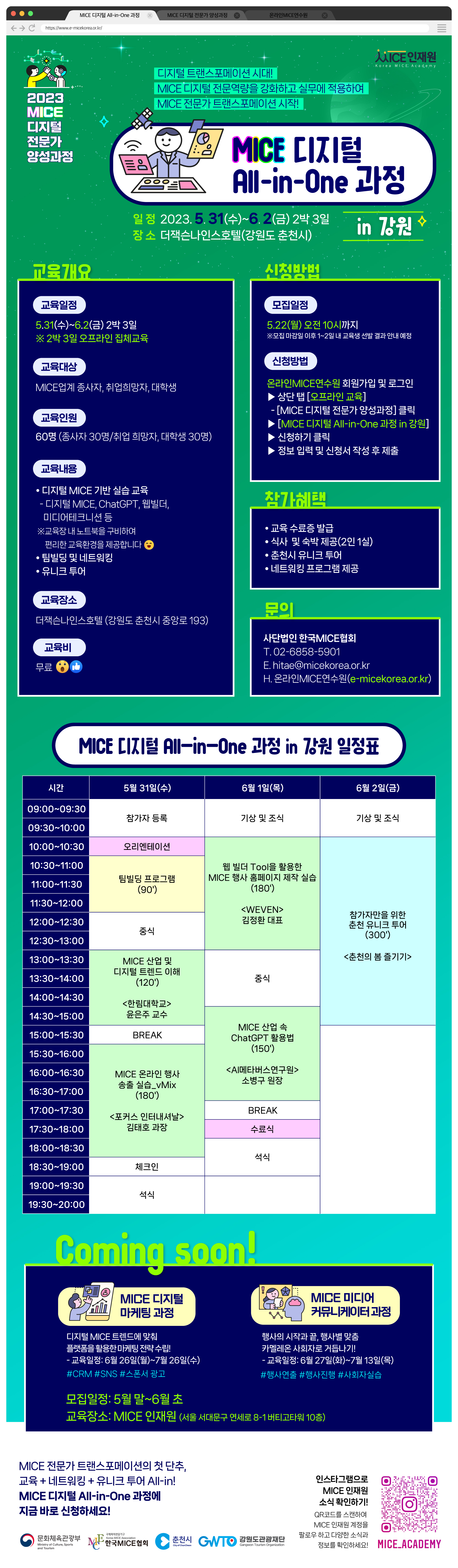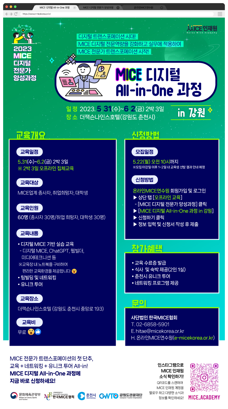 MICE 디지털 All-in-One 과정 in 강원 교육생 모집(\~5/22) 디지털 트랜스포메이션 시대! MICE 디지털 전문역량을 강화하고 실무에 적용하여 MICE 전문가 트랜스포메이션 시작! 2023 MICE 전문가 트랜스포메이션의 첫 단추, 교육 + 네트워킹 + 유니크 투어 All-in! MICE 디지털 All-in-One 과정에 지금 바로 신청하세요! ◈교육개요 *모집대상: MICE 업계 종사자 30명, 취업희망자 및 대학생 30명 *교육일정: 2023년 5월 31일(수) \~ 6월 2일(금), 2박 3일 *교육장소: 더잭슨나인스 호텔(강원 춘천시 중앙로 193) *교육내용 ①디지털 MICE 기반 실습 교육 ※디지털 MICE, ChatGPT, 웹빌더, 미디어테크니션 등 ※교육장 내 노트북을 구비하여 편리한 교육환경 제공 ②팀 빌딩 및 네트워킹 ③춘천시 유니크 투어 *교육비: 무료 ◈신청방법 *신청기간: 2023년 5월 22일(월) 오전 10시까지 ※모집 마감일 이후 1\~2일 내 교육생 선발 결과 안내 예정 *신청방법 ①온라인MICE연수원 회원가입 및 로그인(www.e-micekorea.or.kr) ②상단 탭[오프라인 교육] - [MICE 디지털 전문가 양성과정] 클릭 ③[MICE 디지털 All-in-One 과정 in 강원] 신청하기 클릭! ④정보 입력 및 신청서 작성 후 제출 ◈참가혜택 *교육 수료증 발급 *식사 및 숙박 제공(2인 1실) *춘천시 유니크 투어 *네트워킹 프로그램 제공
