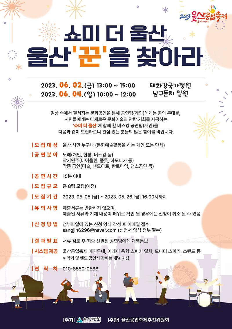 2023 울산공업축제 쇼미 더 울산 울산'꾼'을 찾아라 2023. 06. 02.(금) 13:00\~15:00 2023. 06. 04.(일) 10:00\~12:00 태화강국가정원 남구둔치 일원 일상 속에서 펼쳐지는 문화공연을 통해 공연팀(개인)에게는 꿈의 무대를, 시민들에게는 다채로운 문화예술의 관람 기회를 제공하는 '쇼미 더 울산'이 함께 할 버스킹 공연팀(개인)을 다음과 같이 모집하오니 관심 있는 분들의 많은 참여를 바랍니다. 모집대상 : 울산 시민 누구나(문화예술활동을 하는 개인 또는 단체) 공연분야 : 노래(개인, 합창, 버스킹 등), 악기연주(바이올린, 플롯, 하모니카 등), 각종 공연(미술, 샌드아트, 판토마임, 댄스공연 등) 공연시간 : 15분 이내 모집규모 : 총 8팀 모집 모집기간 : 2023. 05. 05.(금) \~ 2023. 05. 26.(금) 16:00시까지 유의사항 : 제출서류는 반환하지 않으며, 제출 서류와 기재 내용이 허위로 확인 될 경우에는 신청이 취소 될 수 있음 신청방법 : 첨부파일에 있는 신청 양식 작성 후 이메일 접수 sangjin6296@naver.com(신청서 양식 첨부 필수) 결과발표 : 서류 검토 후 최종 선발된 공연팀에게 개별통보 혜택: 범서온천지지워터피아 온천권 2매(한 팀당 2매) 시스템제공 : 울산공업축제 메인무대, 어레이 음향 스피커 일체, 모니터 스피커, 스탠드 등 ※악기 및 밴드 공연시 장비는 개별 지참 연락처 : 010-8550-0588