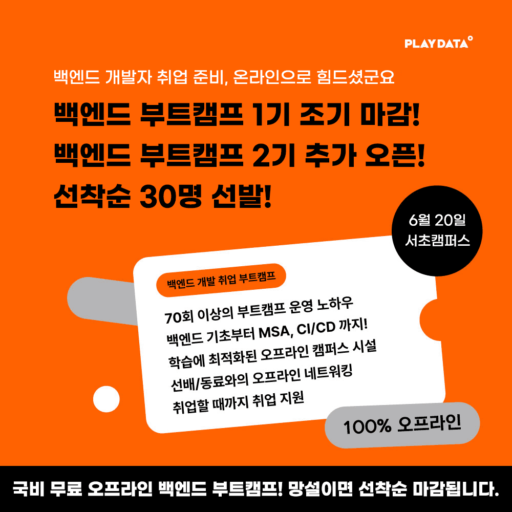 ✨백엔드 부트캠프도 역시 오프라인✨ 플레이데이터가 백엔드 부트캠프를 시작합니다. 1기 조기마감으로 바로 2기를 모집합니다. 백엔드 기초부터 MSA와 CI/CD 꽉꽉 눌러담아 매력적인 백엔드 개발자로 만들어 드립니다! 📢2기도 선착순 30명 선발 마감! 지금 신청하세요