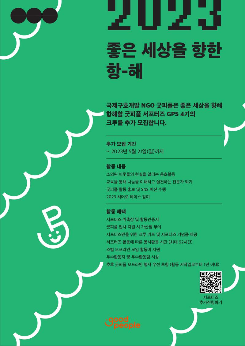 굿피플과 함께 좋은 세상을 만들어 갈 굿피플 서포터즈 GPS 4기를 다음과 같이 추가 모집합니다.