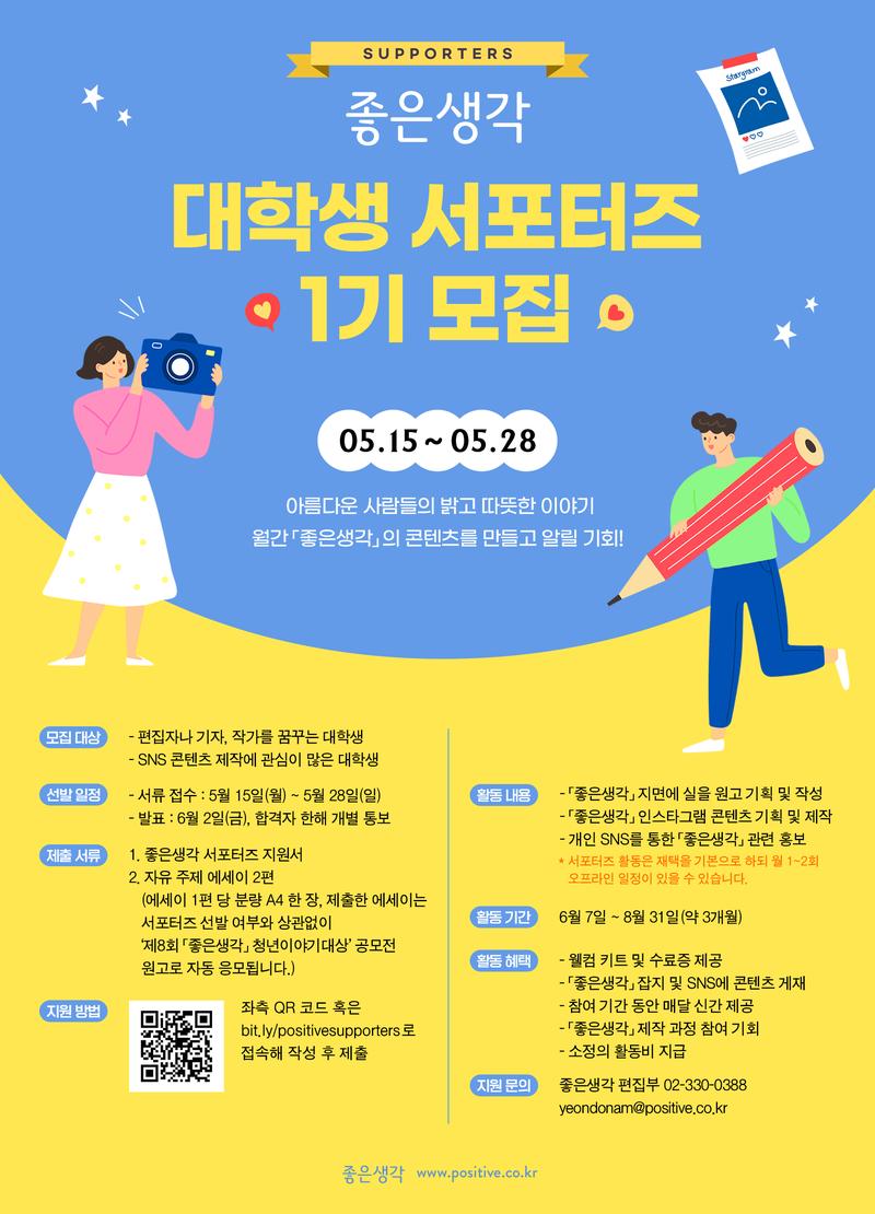 - 자유 주제 에세이 2편 (에세이 1편 당 분량은 A4 한 장\, 제출한 에세이는 서포터즈 선발 여부와 상관 없이 '제8회 「좋은생각」 청년 이야기 대상' 공모전 원고로 자동 응모됩니다. )