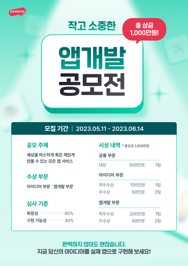◼︎ 일정 제출기한 : 2023.05.11 - 2023.06.28 수상작 발표 : 2023.07.05 * 스파르타코딩클럽 홈페이지 내 공지