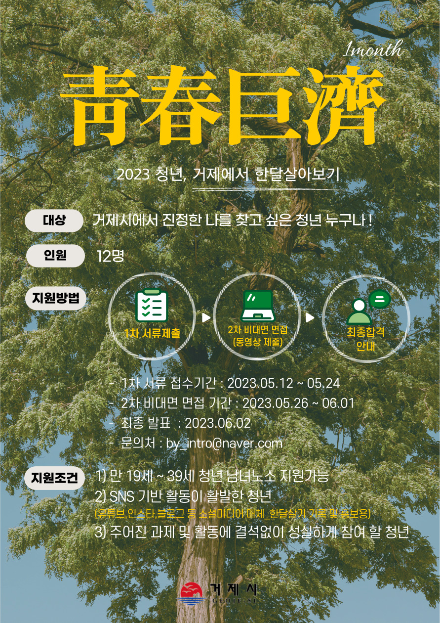 [지원조건] - 대상 : 만 19세 \~ 39세 - SNS(블로그\,유튜브\,인스타 등)를 통하여 거제시 관광 홍보가 및 SNS 기반 활동이 활발한 청년 *개인 SNS 1개 이상 필수 / 1일 1포스팅 가능한 자 - 주어진 과제 및 활동에 결석없이 성실하게 참여 할 수 있는 자