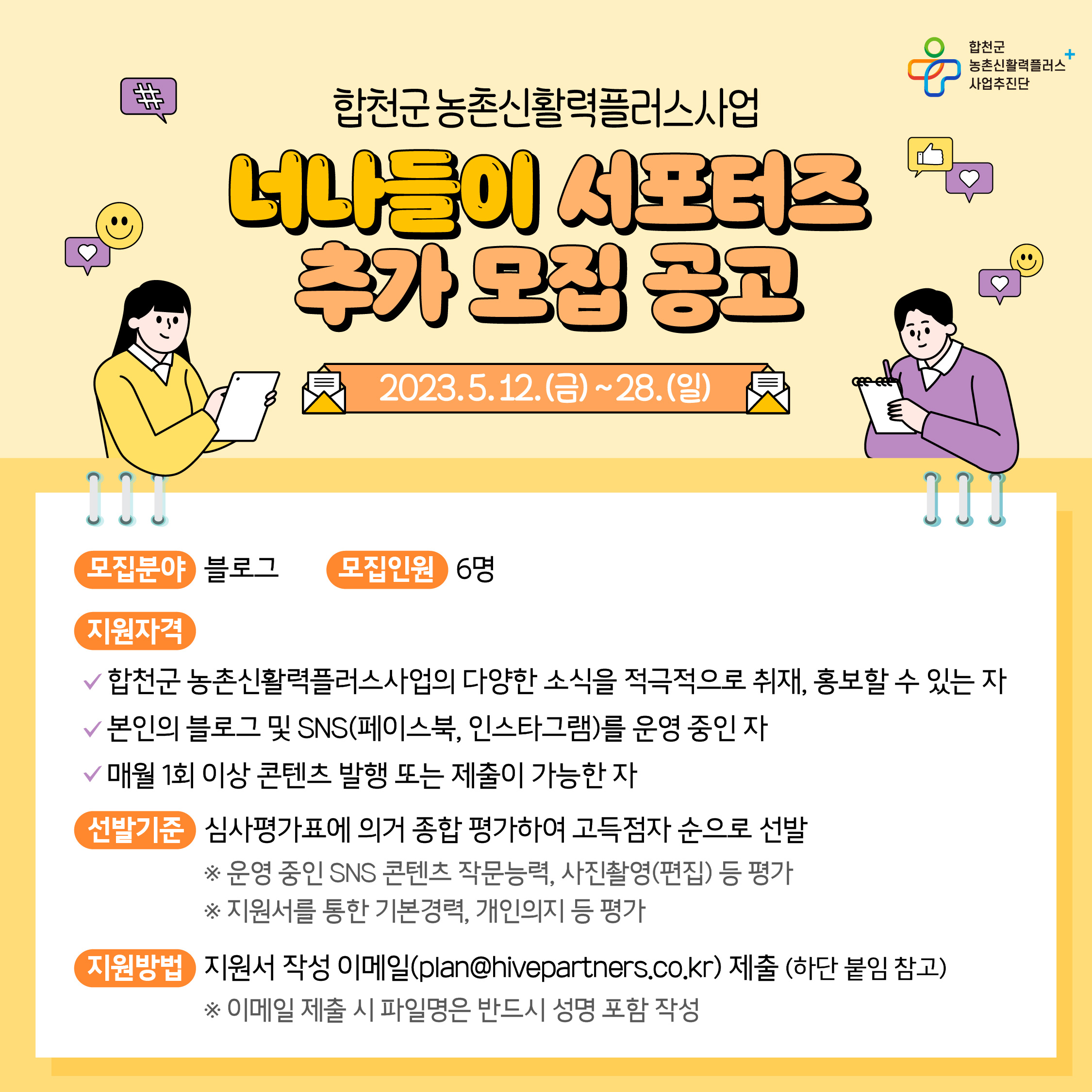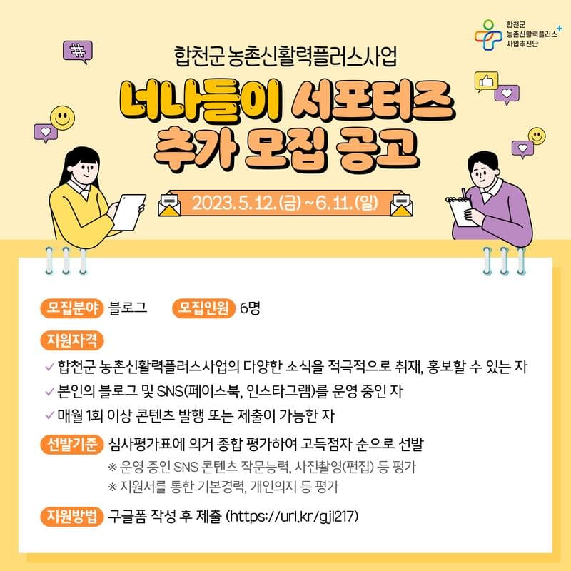 합천군 농촌신활력플러스사업과 SNS를 통해 '너나들이' 서포터즈를 다음과 같이 추가 모집합니다.