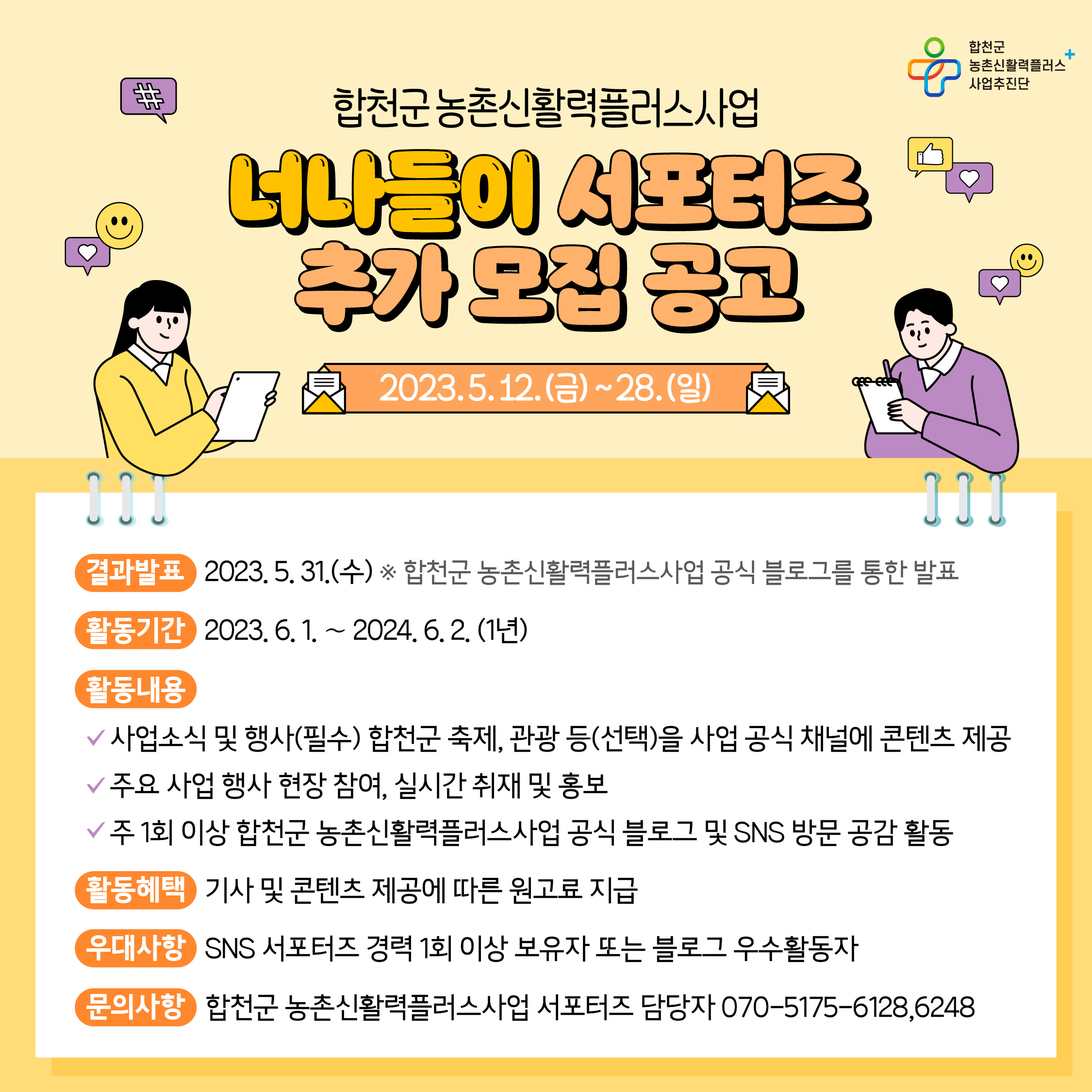 합천군 농촌신활력플러스사업 서포터즈 담당자 ☎ 070-5175-6128,6248