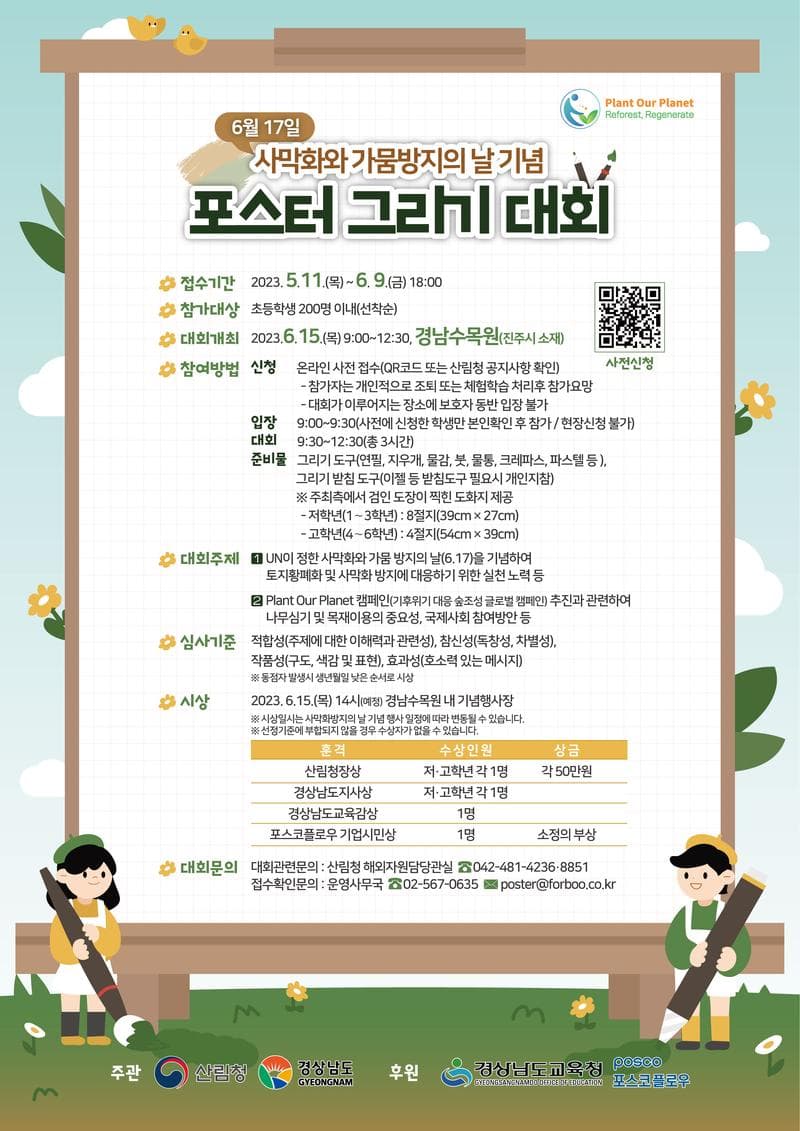 1. 목적 o 사막화와 가뭄방지의 날(6.17) 계기, 초등학생이 참여하는 포스터 그리기 대회 개최로 사막화방지 활동과 나무심기에 대한 인식제고 o 2023년 추진중인 Plant Our Planet(POP) 캠페인과 관련하여 기후위기 대응을 위한 숲조성의 중요성을 강조