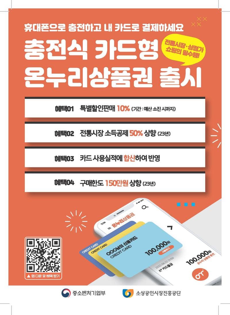 🧡"온누리상품권" 앱 이용 혜택🧡 1. 특별할인판매 10% (기간 : 예산소진까지) ex) "온누리상품권"앱 내 충천 10만원 시, 연동된 계좌로 10%할인된 가격 9만원이 지출됩니다. 2. 전통시장 소득공제 50% 적용 (23년 기준 상향) 3. 카드 사용실적에 합산되어 반영 (ex.주거래카드\, 동백전 등) 4. "온누리상품권"앱 내 충전한도 월 150만원(23년 기준 상향)