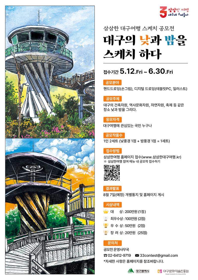 ※ 시상내역은 응모작품수, 작품수준 등에 따라 변경될 수 있음 ※ 3대문화권 홈페이지(www.삼삼한대구여행.kr) 및 대구문화예술진흥원 홈페이지 (https://dgfca.or.kr/main) 공지 및 개별 통보 ※ 공모전 상금이 25만원을 초과하는 경우 제세공과금 22%를 제하고 지급될 예정입니다. ※ 문 의 처 : 공모전 운영사무국 (☏ 02-6412-9719, E-mail : 33contest@gmail.com)