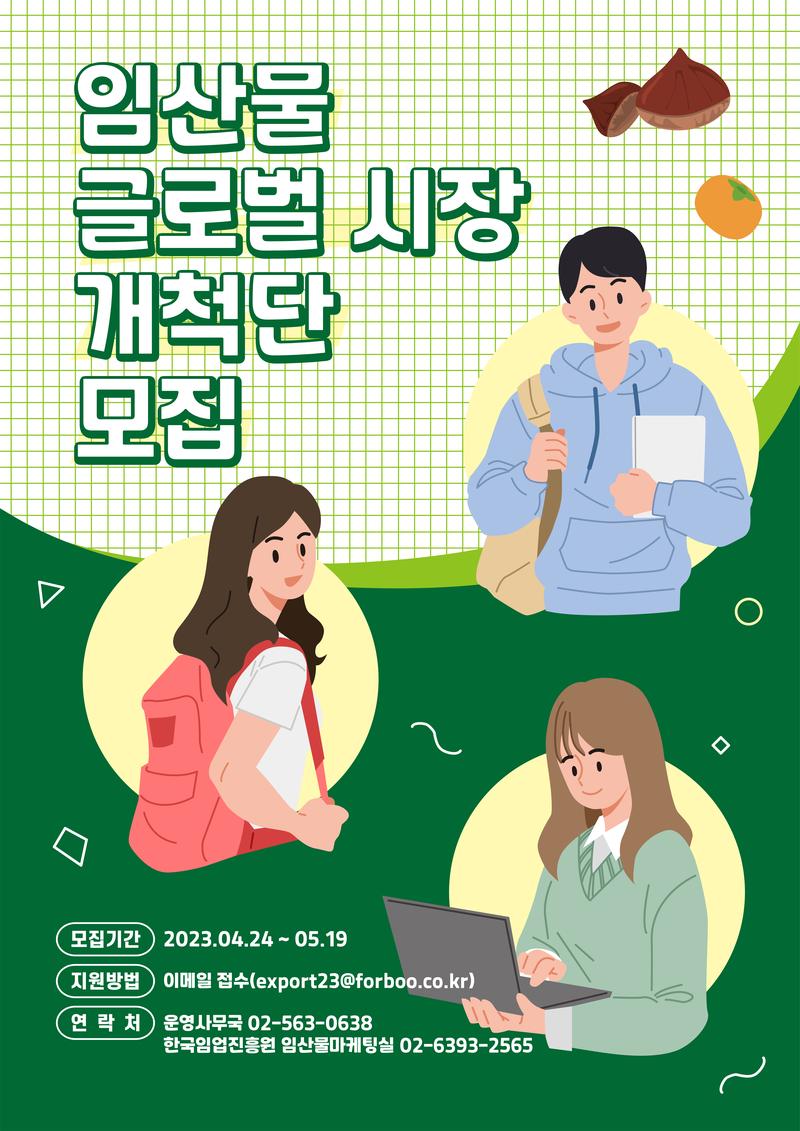 한국임업진흥원은 수출 초보 임업인의 해외시장 조사 비용 절감 및 수출 전 시행착오를 줄이기 위해, '임산물 글로벌 시장 개척단'을 통해 수출 유망업체에게 해외 소비자 및 현지 시장에 대한 기초 정보를 제공하고자 합니다. '임산물 글로벌 시장 개척단'은 한국의 임산물(대추, 감, 밤, 산나물 등) 수출을 희망하는 기업을 지원하는 민간 자문단입니다. 건강하고 맛있는 임산물에 관심 있는 국내 거주 외국인(외국인 유학생, 결혼이주여성) 및 국외거주 한국인(유학생, 교민)의 많은 참여를 부탁드립니다. - 아 래 - ○ 모집 대상 : 모집 국가 출신의 이주여성, 외국인 유학생 및 해외 거주 재외교민, 한국유학생 등 한국어와 현지어에 능통한 자 * (모집 국가) 일본, 중국, 미국, 베트남, 홍콩, 캐나다, 러시아 ○ 모집 기간 : 2023. 4. 24.(월)\~ 5.19.(금) 16:00까지 제출 ○ 접수방법 : (붙임1) 임산물 글로벌 시장개척단 신청서, (붙임2) 개인정보 동의서 작성 후, 메일(export23@forboo.co.kr) 제출 ○ 활동 분야 - (마켓테스트) 수출을 희망하는 기업의 제품을 시식해보고 제품의 맛, 가격, 품질, 디자인 등을 평가하는 설문 응답 - (해외시장정보 수집) 현지 온라인몰에 입점되어 있는 타국가 경쟁제품의 정보 수집 및 인터넷 검색, 관련기관 유선문의를 통한 수출관련 현지 정보 수집 ○ 임산물 글로벌 시장 개척단 제공사항 - (마켓테스트) 회의 참가 시, 회의(2시간 기준) 참가수당 100천원 지급 - (해외시장정보 수집) 조사지역의 보고서 결과물의 완성도, 신뢰도,수혜기업의 만족도 등을 고려하여 조사 수당 차등 지급 * (최우수) 150천원, (우수) 120천원, (일반) 90천원, (미흡) 70천원 ○ 문의안내 - 서포터즈 관련 : 한국임업진흥원 임산물마케팅실(☎02-6393-2565) - 접수확인 관련 : 임산물 글로벌 시장 개척단 운영 사무국(☎02-583-0638) 관심있는 분들의 참여를 부탁드리며, 자세한 내용은 공고 첨부파일을 확인해 주시기 바랍니다.