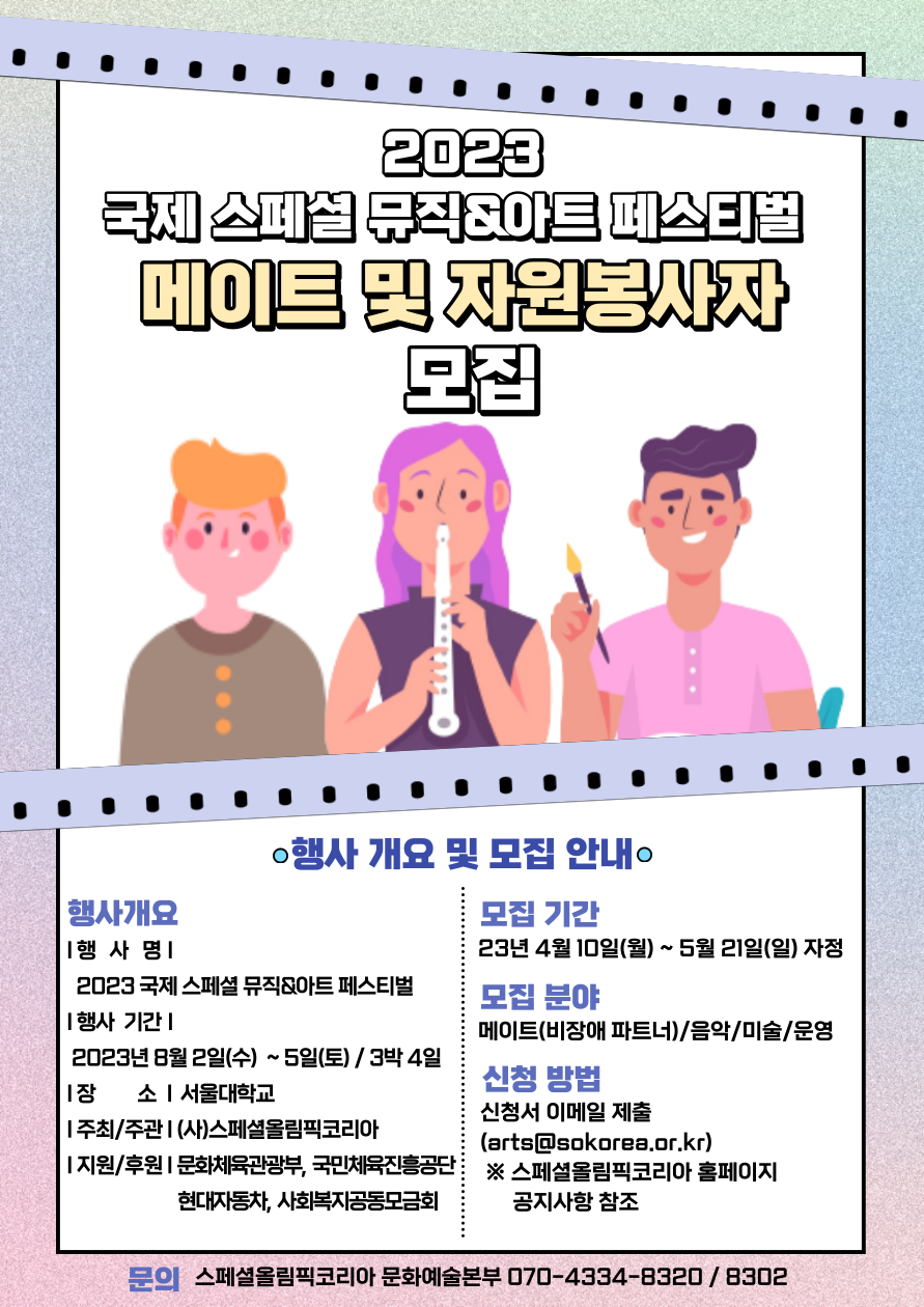 (사)스페셜올림픽코리아에서 '2023 국제 스페셜 뮤직&아트 페스티벌'의 메이트(Mate) 및 자원봉사자를 모집합니다. 10주년을 맞이하여, 서울에서 새로운 시작을 함께할 참가자를 아래와 같이 모집하오니, 많은 관심과 참여 부탁드립니다.