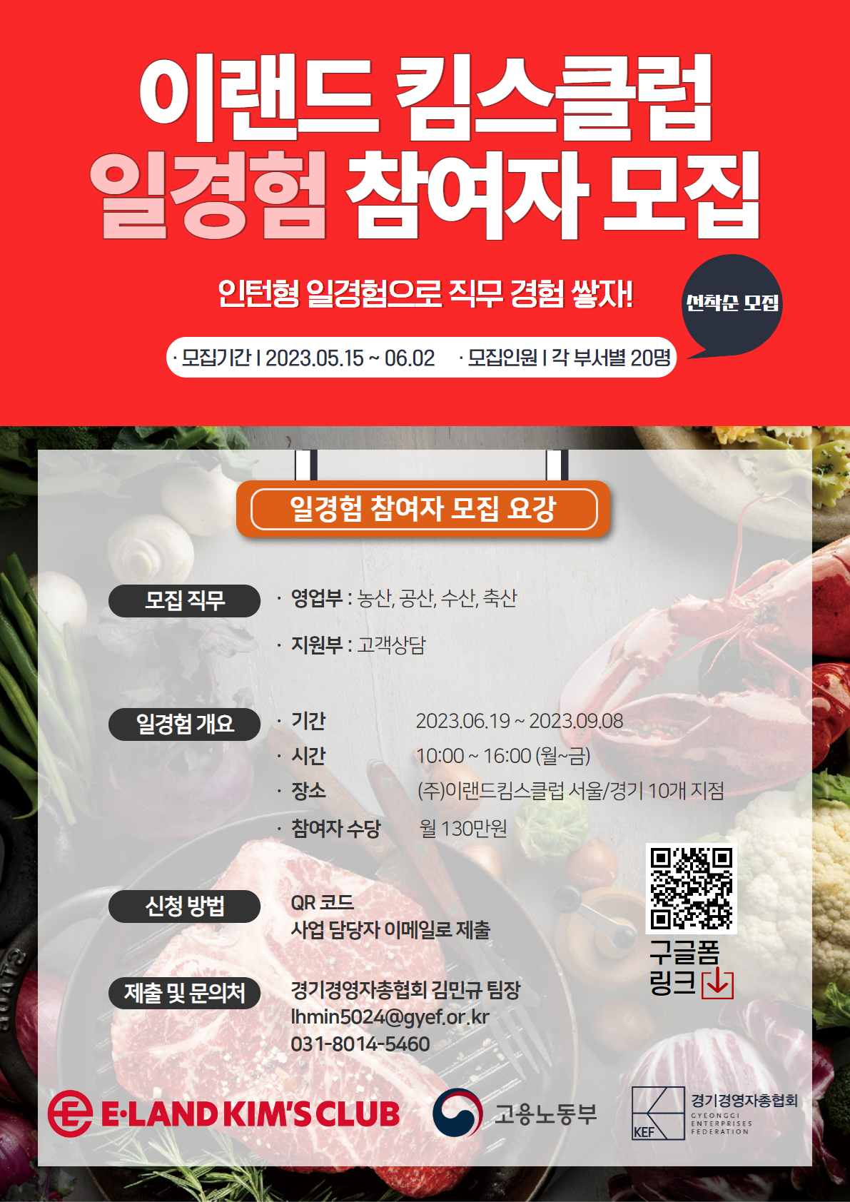 - 기업 일경험 (사전 직무교육 수료 후 12주) : 2023.06.19(월) \~ 2023.09.08(금) / (주)이랜드킴스클럽 서울/경기 10개 지점(참여자 희망 지점 우선 배치) 서울점 - 뉴코아 강남점 / NC강서점 / NC신구로점 / NC 불광점 / NC송파점 수도권점 - 뉴코아 평촌점 / 뉴코아 부천점 / 뉴코아 일산점 / NC 야탑점 / 2001 분당점