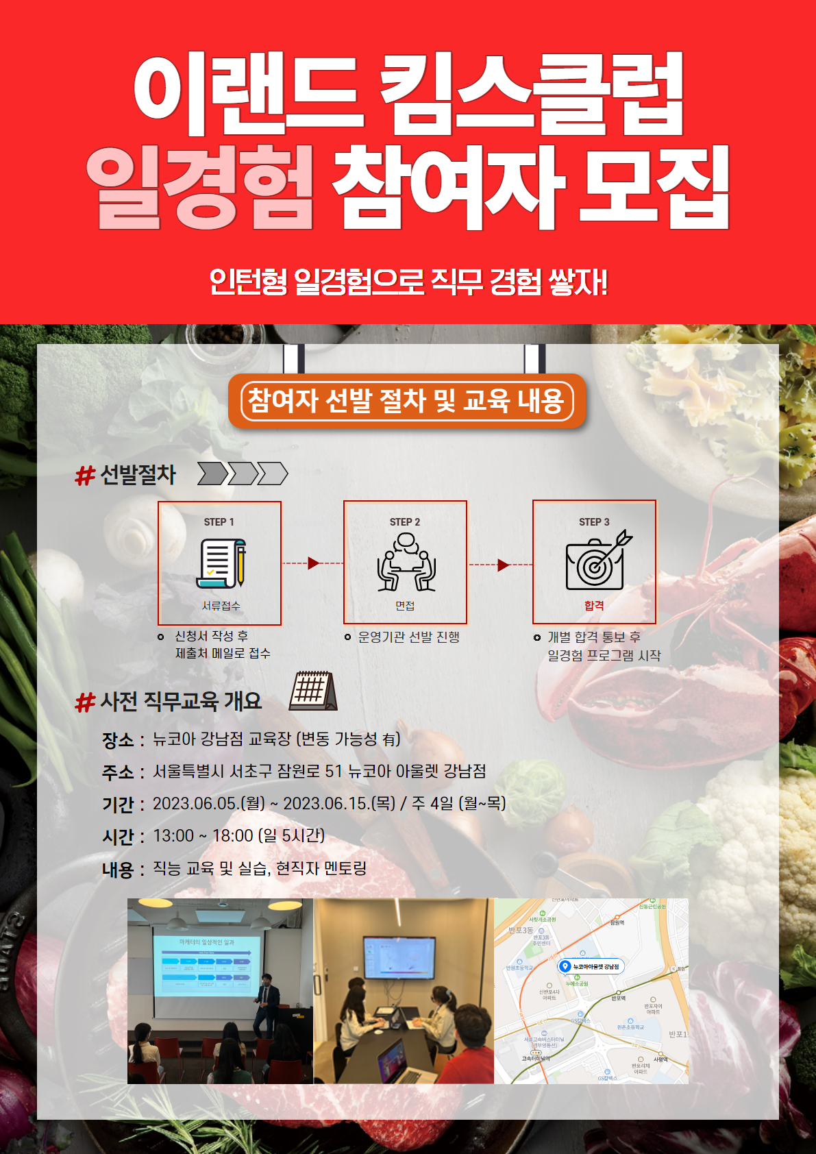 [교육 장소] - 사전 직무교육 (2주) : 2023.06.05.(월) \~ 2023.06.15(목)] / 뉴코아 강남점 교육장(주소 : 서울특별시 서초구 잠원로 51 뉴코아 아울렛 강남점)