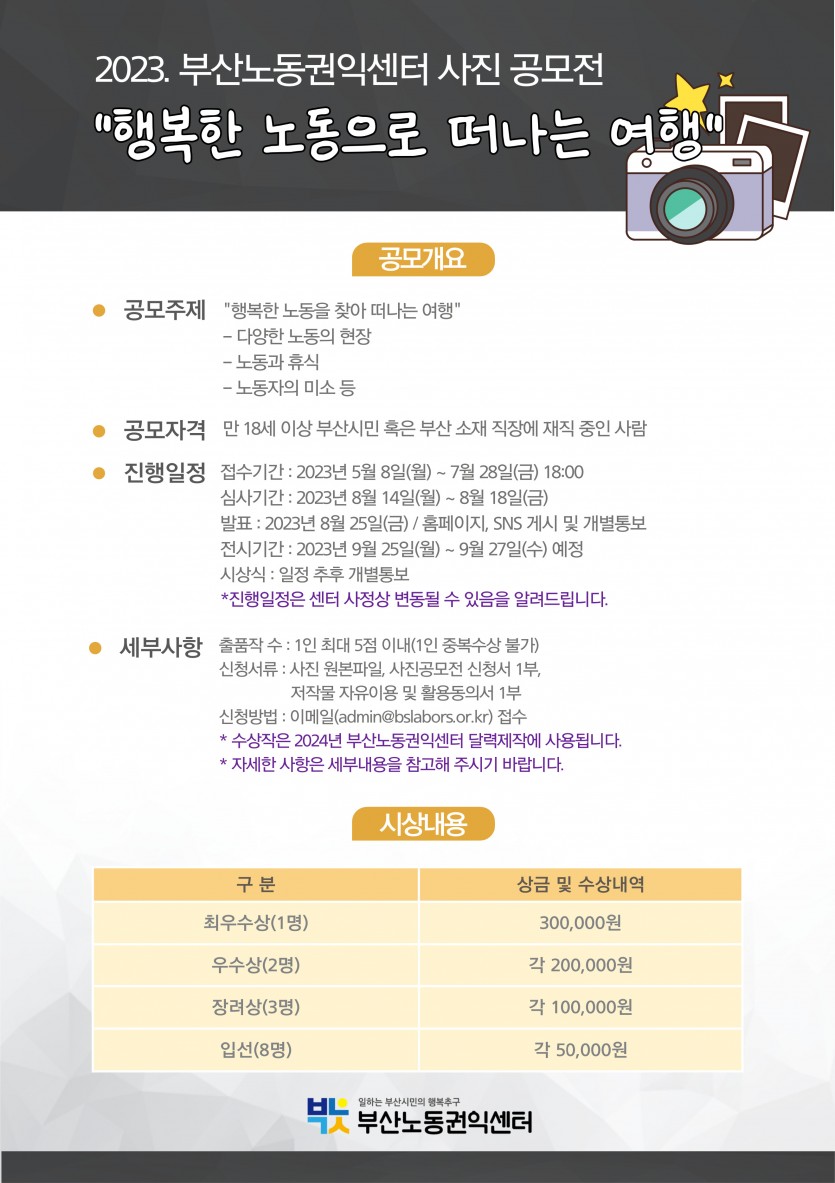 - 공모주제 : 행복한 노동을 찾아 떠나는 여행 - 공모자격 : 만 18세 이상 부산시민/부산소재 직장에 재직 중인 사람 - 공모기간 : 2023.5.8.(월)\~7.28.(금) 18:00 - 심사기간 : 2223.8.14.(월)\~8.18.(금) - 수상발표 : 2023.8.25.(금) / 홈페이지\, SNS 게시 및 개별통보