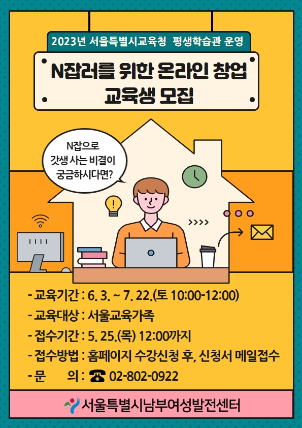 남부여성발전센터에서는 1인 창업의 모든 것, ‘N잡러를 위한 무자본 온라인창업’ 프로그램 교육생을 모집합니다. 나만의 강점을 찾아 진짜 매출과 수입을 만들기까지 노하우가 궁금하신 분들은 지금 바로 신청해주세요.
