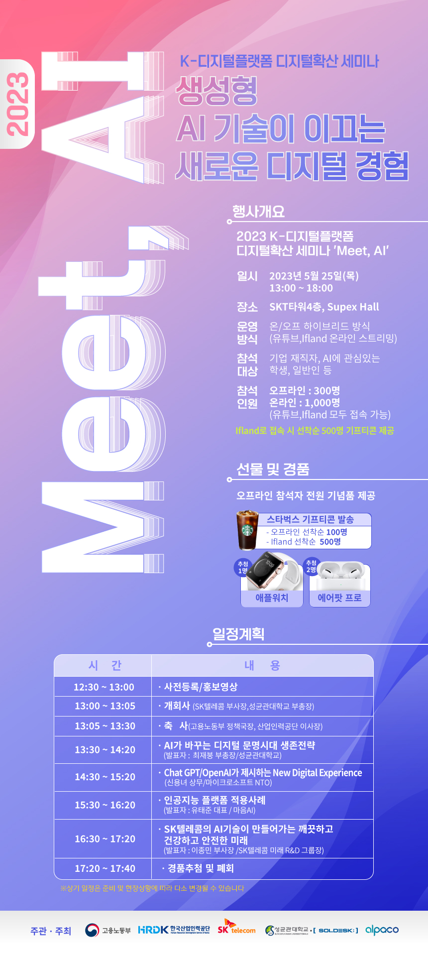 솔데스크 성균관대학교 SKT 함께하는 Meet AI 2023 K 디지털 플랫폼 디지털 확산 세미나. 해당 행사는 참가비없이 무료참가 가능합니다.