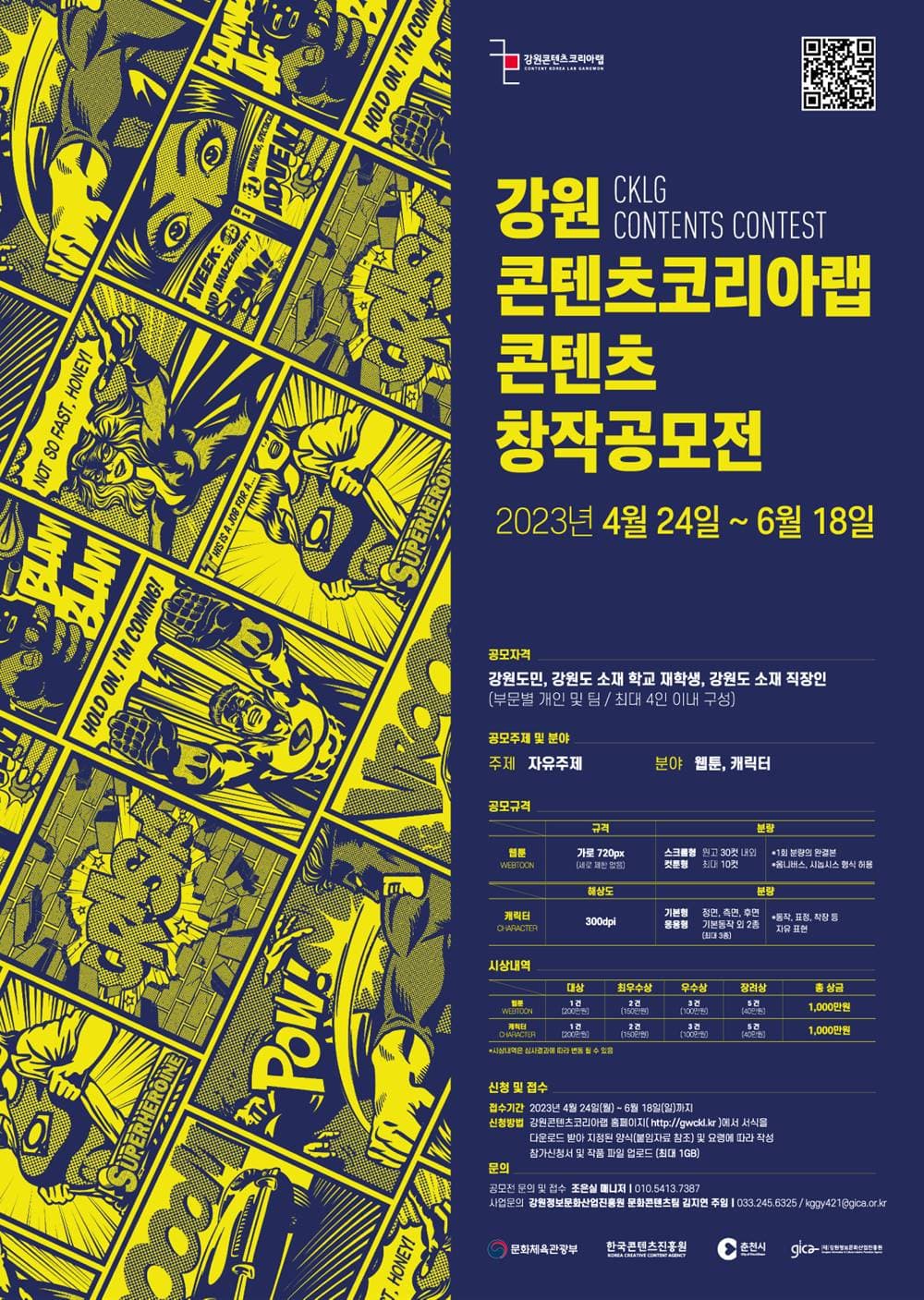 2023 강원콘텐츠코리아랩 창작공모전 공고(웹툰/캐릭터) ○ 공모개요 ■ 창작자 동기 부여 및 지역특화콘텐츠 발굴 ■ 우수 콘텐츠 발굴 및 연계지원을 통한 창작자 역량강화 및 콘텐츠 제작자로 성장할 수 있는 발판 마련 ○ 공모주제 ■ 자유주제의 웹툰 혹은 캐릭터 ○ 기간 및 일정 ■ 2023.04.24 \~ 2023.06.18. ○ 지원자격 ■ 강원도민, 강원도 소재 학교 재학생, 강원도 소재 직장인 (부문별 개인 및 팀 / 최대 4인 이내 구성) ○ 접수방법 ■ 접수기간: 2023년 4월 24일(월) \~ 6월 18일(일) ■ 신청방법: 서식 다운로드 후 구글 폼 접수 - (웹툰) https://forms.gle/w19w9eabYRn1uHkMA - (캐릭터) https://forms.gle/AZfkvM5FDBXBET6a8 - 강원콘텐츠코리아랩 홈페이지(http://gwckl.kr)에서 서식을 다운로드 받아 지정된 양식(붙임자료 참조) 및 요령에 따라 작성 - 서식 페이지에 명시 된 링크 또는 QR코드 확인 ▷ 구글 폼 접속 - 접수형태 및 응모자(대표자) 성명 기입 - 참가신청서 및 작품 파일 업로드 (최대 1GB) - 분야 별 중복지원 가능(수상 중복은 불가) - 제출서류는 신청자의 요청에 의해 임의로 추가 또는 보완될 수 없으며, 일체 반환되지 않음 ○ 출품규격 (웹툰) ■ 규 격 : 가로(720px) x 세로(자율) ■ 제출형식 : JPG 또는 JPEG 형식 ■ 해 상 도 : 300dpi ■ 출품규격 : 스크롤형 원고(30컷 내외) / 컷툰형(최대 10컷) - 1택 ■ 비 고 : 1회 분량 완결본 필수 / 옴니버스 및 시놉시스 형식 허용 (캐릭터) ■ 제출형식 : JPG 또는 JPEG 형식 ■ 해 상 도 : 300dpi ■ 크 기 : A4 ■ 작품설명 : 제작의도, 세계관 등 한글파일 ■ 분 량 : 기본형 1종 - 정면, 측면, 후면 제시 / 응용형 2종[최대 3종] - 동작, 표정, 착장 등 자유 ○ 제출서류 ■ 신청방법: 서식 다운로드 후 구글 폼 접수 - (웹툰) https://forms.gle/w19w9eabYRn1uHkMA - (캐릭터) https://forms.gle/AZfkvM5FDBXBET6a8 ○ 심사기준 ■ 창의성, 대중도, 완성도, 실용성, 사업화 등 - 소재/줄거리 표현방식 등의 창의성 (25점) - 소재 및 형식의 대중성 (25점) - 웹툰/캐릭터 구조 및 연출의 완성도 (25점) - 작품을 통한 사업화 가능성 (창업, 창직, 매출 등) (25점) ○ 시상내역 ■ 웹툰 대상 200만원 1건 최우수상 150만원 2건 우수상 100만원 3건 장려상 40만원 5건 ■ 캐릭터 대상 200만원 1건 최우수상 150만원 2건 우수상 100만원 3건 장려상 40만원 5건 ○ 특전/혜택 - 웹툰/캐릭터 시연회 연계지원 - 입상작 전체 강원콘텐츠코리아랩 내 전시 - 입상작 전체 강원콘텐츠코리아랩 지원사업 신청시 가산점 부여 (입주공간 지원, 전시회 참가지원, 웹툰/캐릭터 시연회 등) ○ 유의사항 - 수상자는 별도의 약정서를 작성하여야 하며 약정 내용을 반드시 준수하여야 함 - 업로드 한 콘텐츠는 순수 창작물이어야 하며, 타 공모전 수상 또는 타인의 지적재산권을 침해한 사실 등이 확인될 경우 심사에서 제외되며, 선정 이후에도 지원취소, 시상금 회수, 민·형사상 법적 조치 등을 취할 수 있음 - 공공장소에 전시될 수 있는 점을 감안하여 표출에 적합한 내용으로 제작하여야 함 - 상업적 목적, 지나치게 선정적, 폭력적이거나 미풍양속에 위배 되는작품은 심사대상에서 제외 - 저작권(서체 등) 및 초상권 침해, 명예훼손 등의 문제가 발생할 경우, 관련된 일체 법적·도의적 책임은 응모자에게 있음 - 콘텐츠의 맞춤법 오류(국립국어원 표기에 따름), 화질 이상, 재생불가 오류 등의 문제로 인한 불이익은 응모자에게 있음 - 상시 공고 내용은 사정에 의해 일부 변경될 수 있으며, 사업 및 접수요령 미숙지에 따른 불이익은 응모자의 책임으로 봄 - 기타 진흥원에서 요청하는 사항에 대하여 성실히 응해야함 ○ 문의 ■ 공모전 문의/접수: 조은실 매니저 / ☎ 010-5413-7387 ■ 사업문의: 강원정보문화산업진흥원 문화콘텐츠팀 김지연 주임 ☎ 033-245-6325 / ⌫ kggy421@gica.or.kr