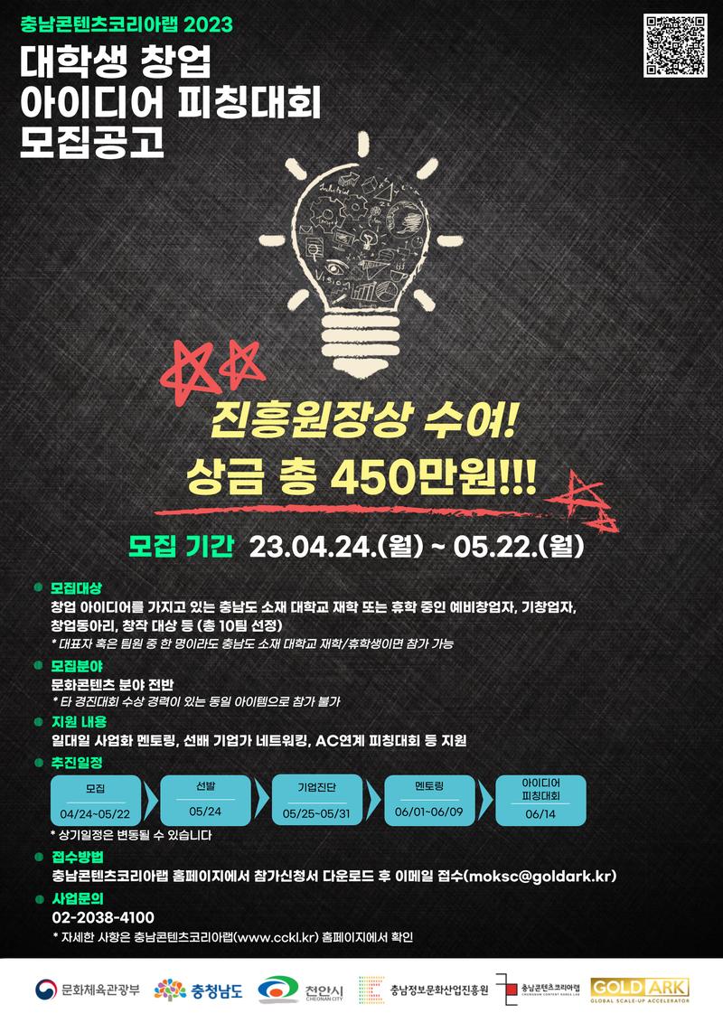 2023 충남콘텐츠코리아랩 대학생 창업 아이디어 피칭대회 모집공고 (재)충남정보문화산업진흥원에서 충청남도 내 대학생들을 대상으로 아이디어 발굴 및 사업화 연계를 지원하는 대학생 창업 아이디어 피칭대회를 아래와 같이 공고합니다. ※캐릭터, 웹툰, 게임, 애니메이션, 음악, 실감콘텐츠(AR/VR, 홀로그램 등) 등 콘텐츠 상품의 기획, 개발, 제작, 생산, 유통, 서비스 등과 관련된 콘텐츠 분야 ※콘텐츠 장르 간, 순수예술과 첨단기술 간, 콘텐츠와 기술 간 융합에 기반한 새로운 창작과 비즈니스 사업화 분야 ▶모집개요 사업목적 : 충남도 내 대학생 사업 아이디어 발굴 및 사업화 연계 접수기간 : 2023년 4월 24일(월) \~ 5월 22일(월) 신청자격 : 창업 아이디어를 가지고 있는 충남도 소재 대학교 재학 또는 휴학 예비창업자, 기청업자, 창업동아리 등 ※ 대표자 혹은 팀원 중 한 명이라도 충남도 소재 대학교 재학/휴학생이면 참가 가능 모집규모 : 총 10팀 ▶지원내용 및 혜택 지원내용 : 역량진단, 분야별 멘토링, 선배 기업가 강연 및 네트워킹, 아이디어 피칭대회 지원혜택 : 우수팀 대상 상금 지급 및 진흥원장 상 수여 ▶지원방법 *충남콘텐츠코리아랩 홈페이지 (www.cckl.kr) 에서 참가신청서 다운로드 후 이메일 접수(moksc@goldark.kr) ▶사업문의 문의 : (주)골드아크 연락처 : 02-2038-4100