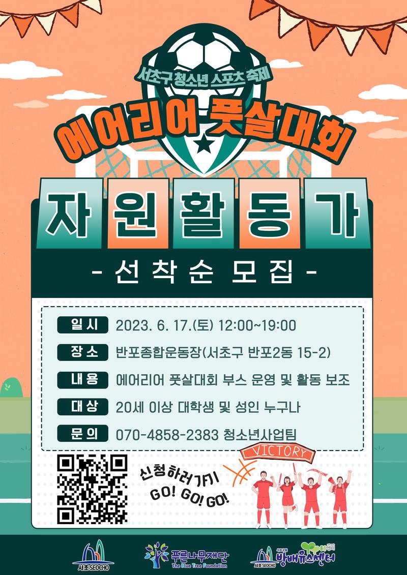 안녕하세요. 방배유스센터입니다. 6월 17일 토요일 서초구 청소년들의 뜨거운 풋살대회에 함께 참여할 봉사자를 모집합니다. ※모집인원: 20세 이상 대학생 및 성인 30명 ※모집기간: 2023.06.13.(화) 까지 ※활동기간: 2023.06.17.(토) 12:00\~19:00 ※활동장소: 반포종합운동장(서초구 반포2동 15-2) ※내용: 풋살대회 행사보조(축제 운영에 필요한 전반적인 행사보조) ※혜택: 봉사활동 시간 지급 및 간식 제공 ※문의: 070-4858-2383 방배유스센터 청소년사업팀 홍정모