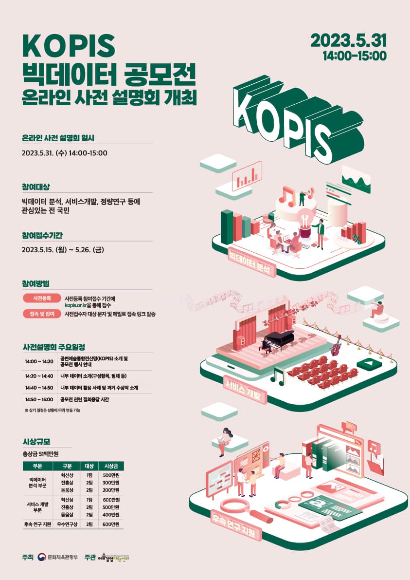 총상금 약 5,100만원! 최우수상 600만원! 2023년 5월 31일, <제3회 KOPIS 빅데이터 공모전 온라인 사전 설명회>가 개최됩니다. KOPIS 빅데이터 공모전은 공연 전산망 및 외부데이터 결합을 통해 혁신적 분석 결과 및 모형을 도출해 내어, 공연예술시장 활성화 및 고도화에 기여할 수 있는 창의적 아이디어를 지닌 전 국민을 대상으로 진행하는 공모전입니다. 본 공모전 진행에 앞서 관심이 있는 분들의 궁금증을 해소하고, 더욱 자세한 공모전에 대한 안내를 드리고자 사전설명회를 진행합니다.