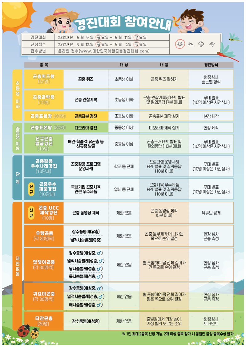 1️⃣ 경진대회 참가접수 2023년 5월 12일(금) 10:00 Open \~ 6월 2일(금) 18:00 마감 접수신청은 공식 홈페이지에서 www.대한민국애완곤충경진대회.com