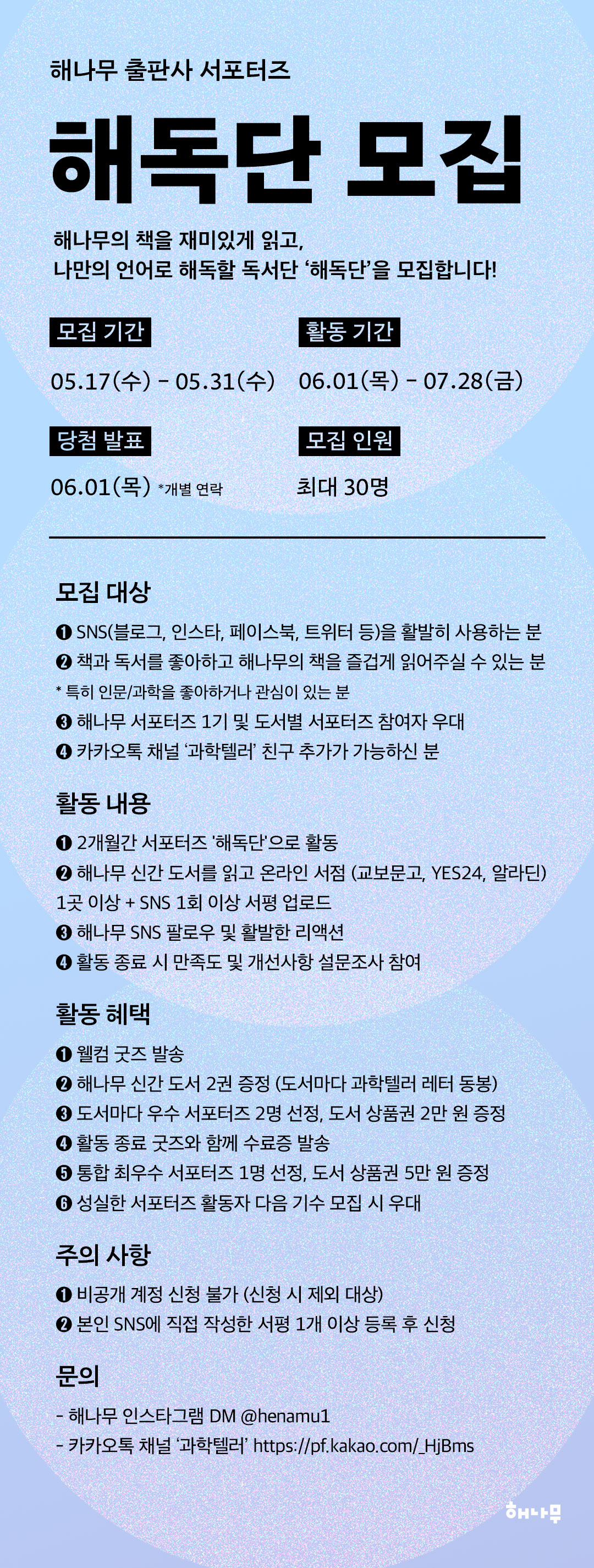 어려운 과학, 과학텔러가 꼭꼭 씹어 알기 쉽게 🤓 과학·인문 출판사 해나무의 책을 재미있게 읽고, 나만의 언어로 해독할 독서단 "해독단📚"을 모집합니다.