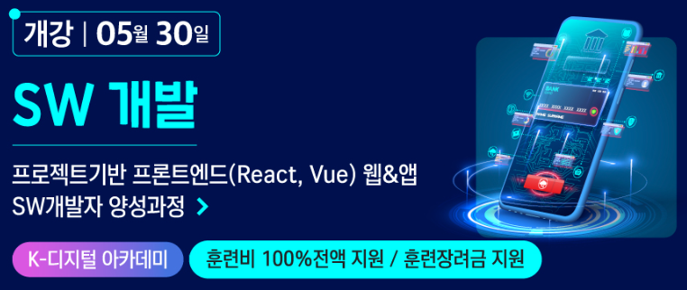 ■ 11기 ■ 강의이름 : 프로젝트기반 프론트엔드(React,Vue) 웹&앱 SW개발자 양성과정 훈련정원 : 20명 교육일정 : 11회차 23.05.30 \~ 23.11.23 교육시간 : 9:30\~18:30 (점심: 13:30\~14:30) 훈련비용 : 9,192,690원 [전액지원] → 총 3개 프로젝트 진행 (프로젝트기반) → 비전공자도 참여 가능! → 매월 훈련장려금 지금 (최대 316,000원) → 전문 직업상담사의 취업지원 시스템 (자기소개서 및 이력서 클리닉, 면접코칭, 채용정보제공, 취업알선 등 → 1대1 취업상담을 통한 교육과정 로드맵 설계