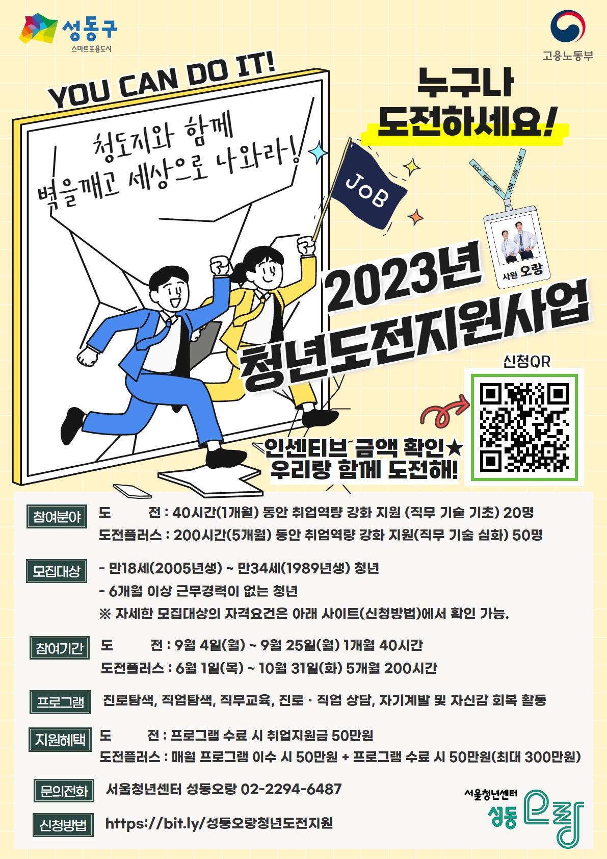 ② 도전 플러스 프로그램 : 50명 모집 - 구직 활동 중ㆍ장기 (상담\, 진로ㆍ직업 탐색\, 구직기초ㆍ기술 교육\, 자기계발 프로그램(강의\, 원데이클래스\, 커뮤니티 활동 등) 외부연계활동\, 자율활동) - 200시간 프로그램 참여(5개월 동안 진행되며 정해져있는 일자에 참여) ※ 기본적인 프로그램 내용은 도전 프로그램과 같으나 도전 프로그램보다 다회차로 프로그램이 운영되어 구직 활동에 대하여 기초부터 심화까지 경험할 수 있습니다. ※ 또한 "외부연계활동"을 통해 보다 다양한 구직 프로그램에 참여 하게 되면 "자율활동"으로 일정 참여 시간을 참여자 본인이 스스로 수행하는 시간을 가질 수 있습니다. 3. 지원 프로그램 수료 시 취업지원금 지원 ① 도전 프로그램 - 40시간 프로그램 이수 완료 시 50만원 취업지원금 지급(1회 지급) ② 도전 플러스 프로그램 - 매월 40시간 프로그램 이수 완료 시 매월 50만원 취업지원금 지급(최대 5회 지급) - 위 월(5개월 동안 매월) 이수 기준을 모두 충족 하여 전체 이수 완료 시 50만원 취업지원금 지급(1회) ★ 도전플러스는 매월 1회 총 5회 + 전체 수료식 1회로 최대 6회의 취업지원금 지급 4. 참여 가능 대상 기준 ① (구직단념청년) - 공통 요건 - 최근 6개월 이상 취업 및 교육ㆍ직업훈련 이력이 없고 구직단념 청년 문답표 21점 이상(만점 30점)인 만 18세\~34세 청년 ※취업은 고용보험DB 상용직 기준으로 자격 확인, 교육ㆍ직업훈련은 HRD net 기준으로 자격 확인 ② (자립준비청년<보호종료아동>) 아동복지시설 등에서 보호받고 퇴소한 자중 퇴소 5년 이내의 청년 또는 퇴소 대상자임에도 불구하고 퇴소 일자를 연기한 청년 ※보호종료 확인서 제출하여 확인 ③ (청소년 쉼터 등 입ㆍ퇴소 청년) 청소년쉼터에서 1년 이상 보호한 만18세 이상의 청년 ※청소년쉼터 입소확인증, 퇴소사실증명서 제출하여 확인 ④ (북한 이탈 청년) 북한을 이탈한 자로서 만18세\~34세 청년 ※북한이탈주민등록확인서(민원24 발급 가능)를 제출하여 확인 ⑤ (지역특화) 위의 요건에 충족이 어려운 청년이라도 지원의 필요성이 있다고 인정 받은 다음의 청년 - 성동구 청년지원 기본 조례에 따른 만19세\~39세 이하 청년 ○ 보호시설(보육원, 보호관찰소 등) 독립 후 개인적 사정 등으로 국민취업지원제도 등 취업지원 서비스 참여가 어려운 청년 ※보호종료 확인서, 청소년 쉼터 입소확인증, 퇴소사실증명서 등 제출하여 확인 ○ 최종학력 졸업 이후 1년 이상 취업ㆍ경제활동을 하지 않고 있으면 구직단념 청년 문답표 21점 이상(만점 30점)인 청년 ○ 심리상담 등 관리가 필요한 청년 있으면 구직단념 청년 문답표 21점 이상(만점 30점)인 청년 ○ 생계형 아르바이트(주30시간 미만 근로) 청년, 경력단절여성, 폐업 자영업 청년이며 구직단념 청년 문답표 21점 이상 (만점 30점)인 청년 ※취업은 고용보험DB 상용직 기준으로 자격 확인, 교육ㆍ직업훈련은 HRD net 기준으로 자격 확인 ○ 취업문제로 졸업을 유예, 장기 휴학 중인 대학생이며 구직단념 청년 문답표 21점 이상(만점 30점)인 청년 ※졸업 유예 확인서, 휴학 확인서 제출하여 확인 5. 참여자 선정 및 참여 프로그램 지정 과정 ※ 본 사업은 워크넷을 통해 참여 신청을 한다고 하여 참석자로 선정되는 것이 아니며 아래의 단계를 거쳐 본 사업에 참여 가능 여부를 심사하여 최종 참여자로 선정됨 - 단계1. 참여자 온라인 신청 실시 - 단계2. 운영기관에서 참여신청 확인하여 신청에서 접수로 변경 > 자격요건 심사 ※자격요건 심사 시에는 전화를 통해 질의응답이 있을 수 있으며 참여희망 프로그램 조사 실시 예정임 - 단계3. 선정자 대상 기초 상담(문답표\, 구직준비도 검사) 실시 ※ 단계2의 자격요건 심사 이후 전화로 기초 상담 일정 안내 > 신청자는 해당 요일에 성동오랑 방문하여 상담 실시 - 지정 일자에 상담이 불가할 경우 담당자와 논의하여 일정 조정 가능함 ※문답표 및 구직준비도 검사를 통해 '도전'과 '도전플러스' 중 1개 프로그램으로 참여를 지정함 - 단계4. 자격 요건 및 기초상담(문답표\, 구직준비도 검사) 결과 참여 가능 점수 기준 이상 시 접수에서 승인 변경 - 단계5. 해당 참여 프로그램 참여 및 이수 6. 참여자 모집 일정 및 프로그램 일정 안내 ① 참여자 모집 일정 ○ 참여자 신청 : 2023. 04. 06. \~ 모집인원 마감 시 까지 ※ 참여자 선정은 신청자에 한하여 수시로 자격 심사 및 기초상담을 실시하여 선정함 ※ 참여자 모집 현황에 따라 신청 기간 연장되어질 수 있음. ② 프로그램 참여 일정 안내 ○ 도전 프로그램 - 2023년 5월(1개월) 동안 참여 - 15명 - 매주 월요일\, 화요일\, 목요일 13:00\~18:00 - 2023년 9월(1개월) 동안 참여 - 15명 - 매주 월요일\, 화요일\, 목요일 13:00\~18:00 ○ 도전 플러스 프로그램 - 2023년 6월\~10월(5개월) 동안 참여 - 매주 월요일\, 화요일\, 목요일 13:00\~18:00 7. 청년도전지원사업 참여 신청 - 아래 링크 클릭 하여 상세 내용 확인 [참여자 모집] 청년도전지원사업 참여자 모집_.. : 네이버블로그 (naver.com) - 아래 링크 클릭 하여 페이지 이동 후 페이지 하단의 '신청' 버튼 클릭하여 신청 진행 https://www.work.go.kr/youngChallenge/index.do
