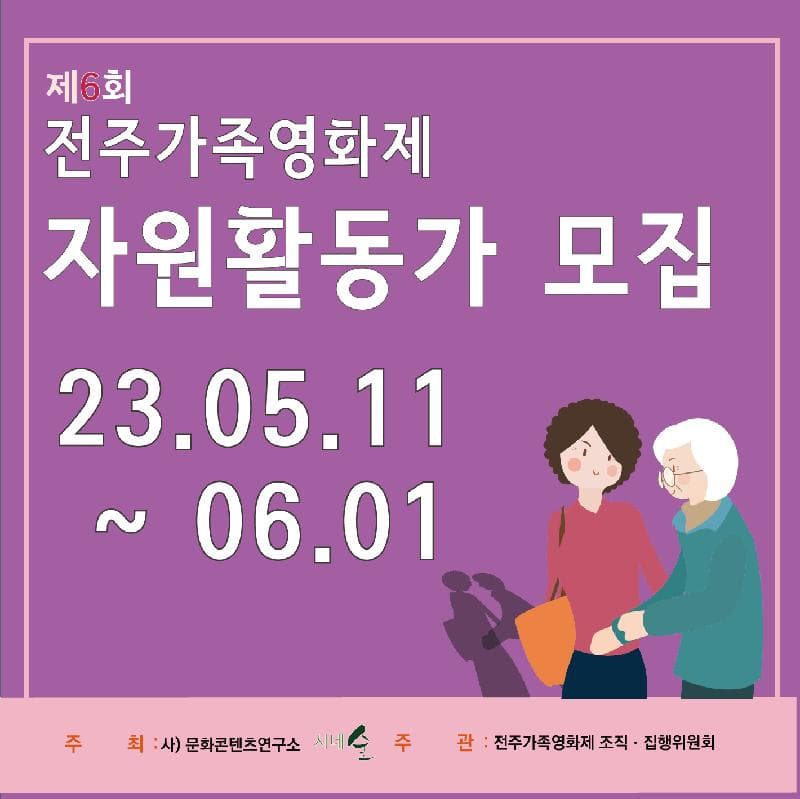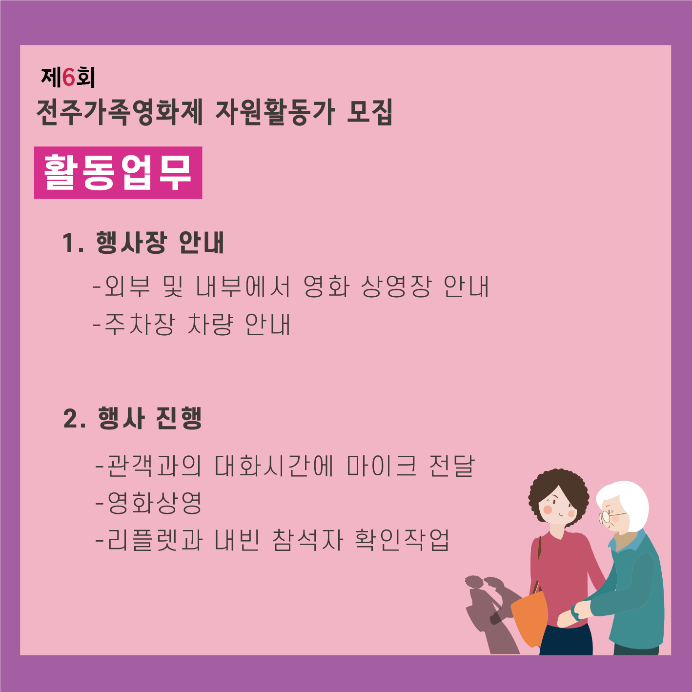 ``` 전주가족영화제에 필요한 자원활동가를 모집합니다. 1. 행사장 안내 -외부 및 내부에서 영화 상영장 안내 -주차장 차량 안내 2. 행사 진행 -관객과의 대화시간에 마이크 전달 -영화상영(담당선생님과 함께 진행 합니다) -리플렛과 내빈 참석자 확인작업 (담당선생님과 함께 진행 합니다)