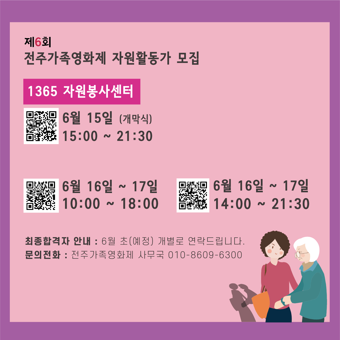 전주가족영화제는 1차 면접으로 자원활동가를 모집하고 있습니다. 영화관 내에서 불쾌한 행동 적발시 귀가조치를 할 수 있습니다 *개성있는 옷보단 활동이 편리한 옷 입기! ex)흰티에 청바지, 검정티에 슬렉스 기능성 운동화 착용해 주시면 더욱 좋을것 같습니다.
