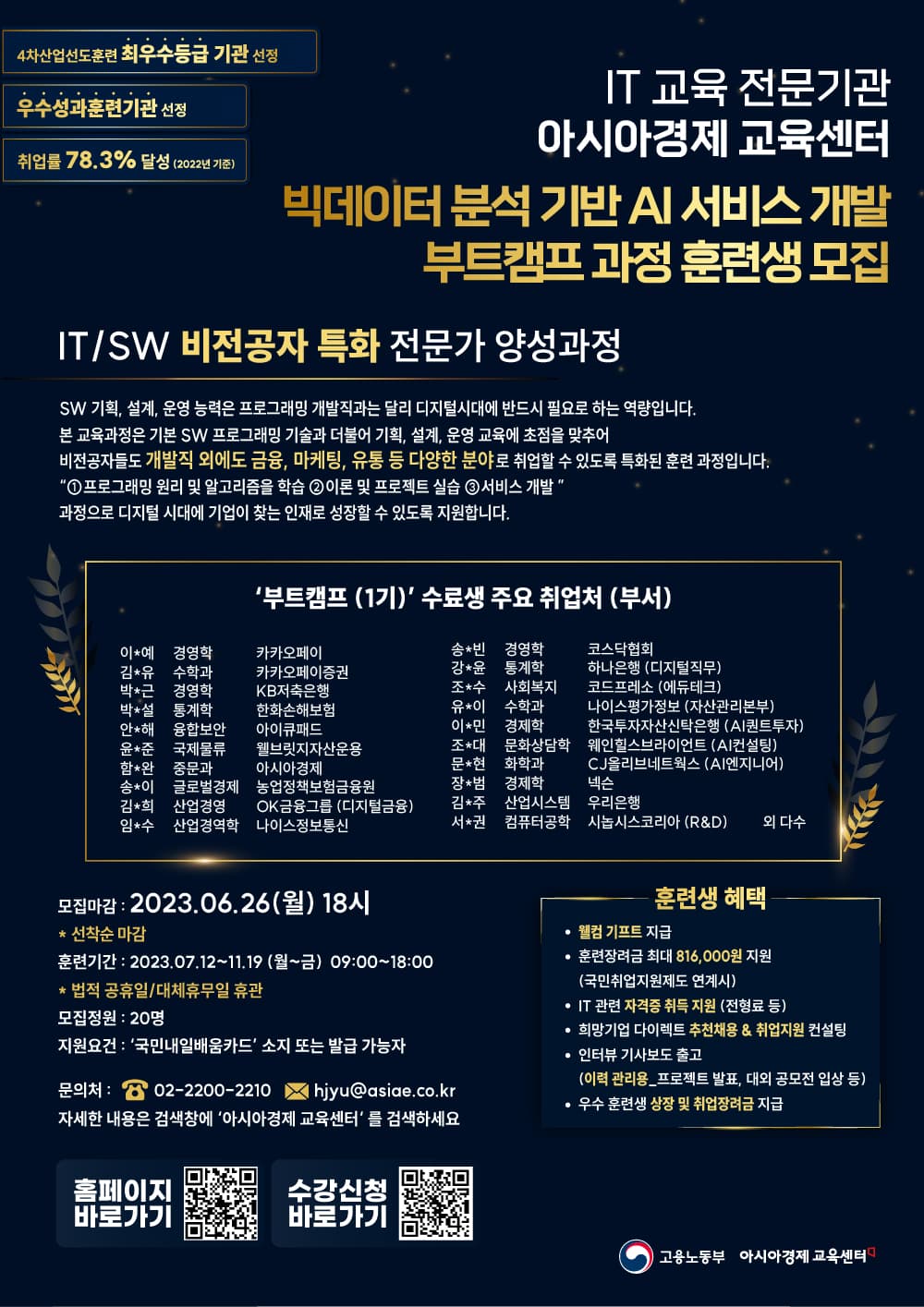 ○ 모집 기간 → \~ 6/26 마감 * 훈련생 전원 웰컴 기프트를 증정하며, 정원 초과 시 조기마감 될 수 있습니다. * 인문·사회·자연계 등 IT 비전공자분들 우대합니다.