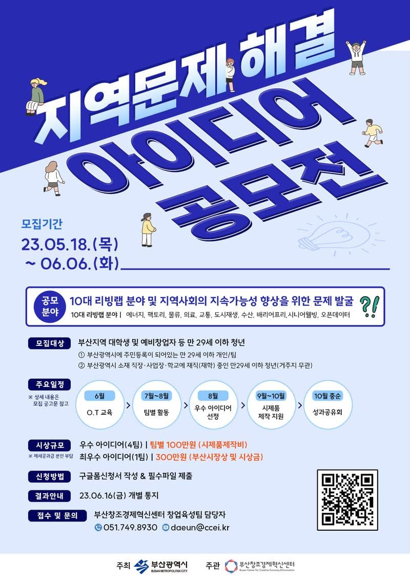 지역문제 해결 아이디어 공모전 참가자 모집 ■ 공모명 : B.Startup 캠퍼스 리빙랩 『지역문제 해결 아이디어 공모전』 ■ 모집 안내 1. 모집기간 : 2023.05.18.(목) \~ 06.06.(화) 2. 모집규모 : 30명 내외 3. 모집대상 : 부산지역 대학생 및 예비창업자 등 만 29세 이하 청년 ① 부산광역시에 주민등록이 되어있는 만 29세 이하 개인/팀 ② 부산광역시 소재 직장·사업장·학교에 재직(재학) 중인 만29세 이하 청년(거주지 무관) ※ 팀으로 신청하더라도 운영 사정에 따라 팀 구성원이 추가 될 수 있음 4. 활동기간 : 2023년 06월 \~ 10월 ■ 신청방법 : 구글폼 신청서 작성 및 필수파일 제출 신청링크 https://forms.gle/3K2jg1gi89hSFoFL6 (바로가기) ▸제출서류 (필수 제출) 공고일 이후 발급된 부산광역시 거주 및 활동 증빙 가능 서류 1부 (주민등록등본, 재학증명서, 재직증명서, 임대차계약서 등 중 택 1) ▸필수파일 이메일 제출 : daeun@ccei.kr ■ 활동 혜택 1. (부산창조경제혁신센터 수료증 발급) 리빙랩 전 과정 80% 이상 참가시 2. (교육지원) 리빙랩 및 문제발굴 교육, 전담 멘토 매칭, 오피스아워 진행 등 3. (시제품 제작비) 우수 아이디어 4개팀 시제품제작비 100만원 지급 4. (우수팀 시상) 최우수 아이디어 1개팀 시상(부산시장상 및 시상금 300만원) 5. (지원사업 연계 및 정보 제공) 부산창조경제혁신센터 주관 창업지원 프로그램 등 ※ 상세내용은 모집공고문 참고 ■ 신청 문의 부산창조경제혁신센터 창업육성팀 담당자 ☏ (전화) 051.749.8930 (이메일) daeun@ccei.kr