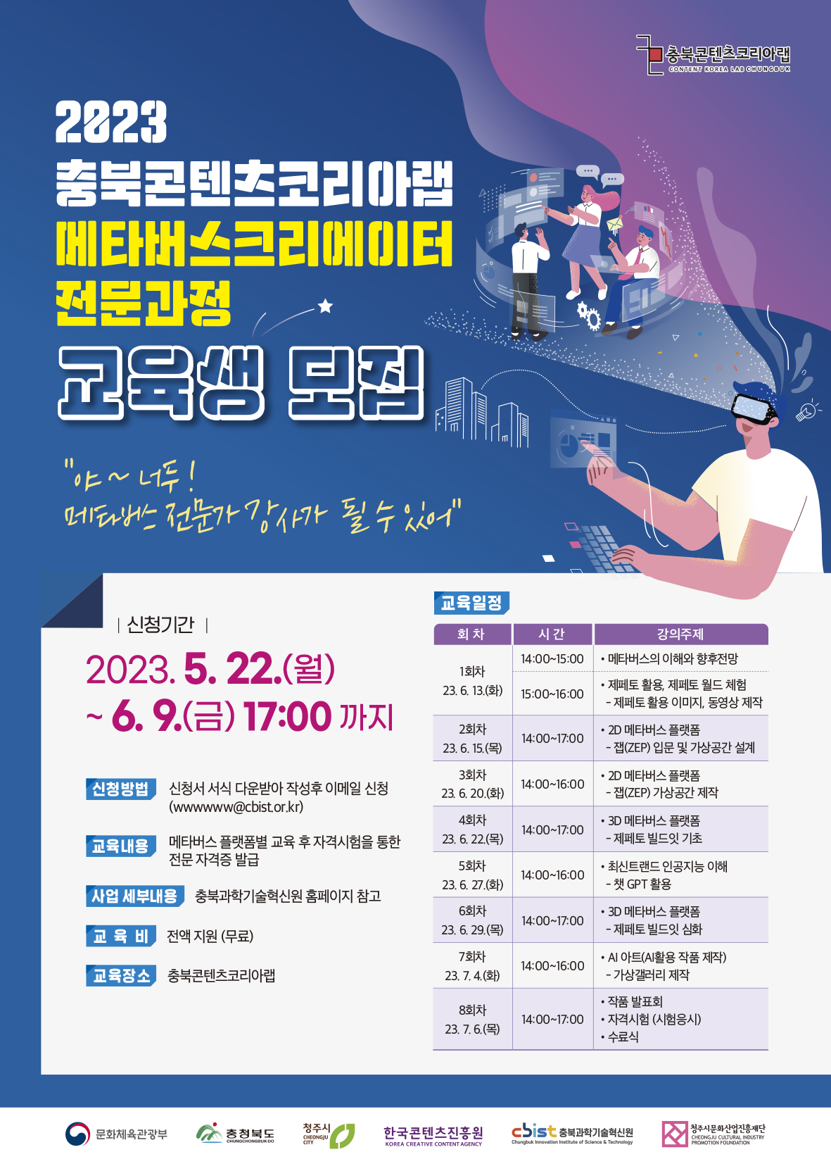 1. 공 고 명 : 2023 충북콘텐츠코리아랩 메타버스크리에이터 자격(전문)과정 교육생 모집 2. 지원규모 : 20명 이내 선착순 3. 지원대상 - 메타버스 자격증 취득을 희망하는 충북 도민 누구나 4. 지원내용 : 메타버스 플랫폼별 대면 교육 및 자격증 취득 5. 지원기간 : 2023. 5. 22.(월) \~ 2023. 6. 9.(금) 6. 지원방법 : 이메일 제출 (wwwwww@cbist.or.kr) - 충북과학기술혁신원 홈페이지 접속 후 해당사업 신청서 서식을 다운 받아 작성하여 첨부서류와 함께 이메일 제출