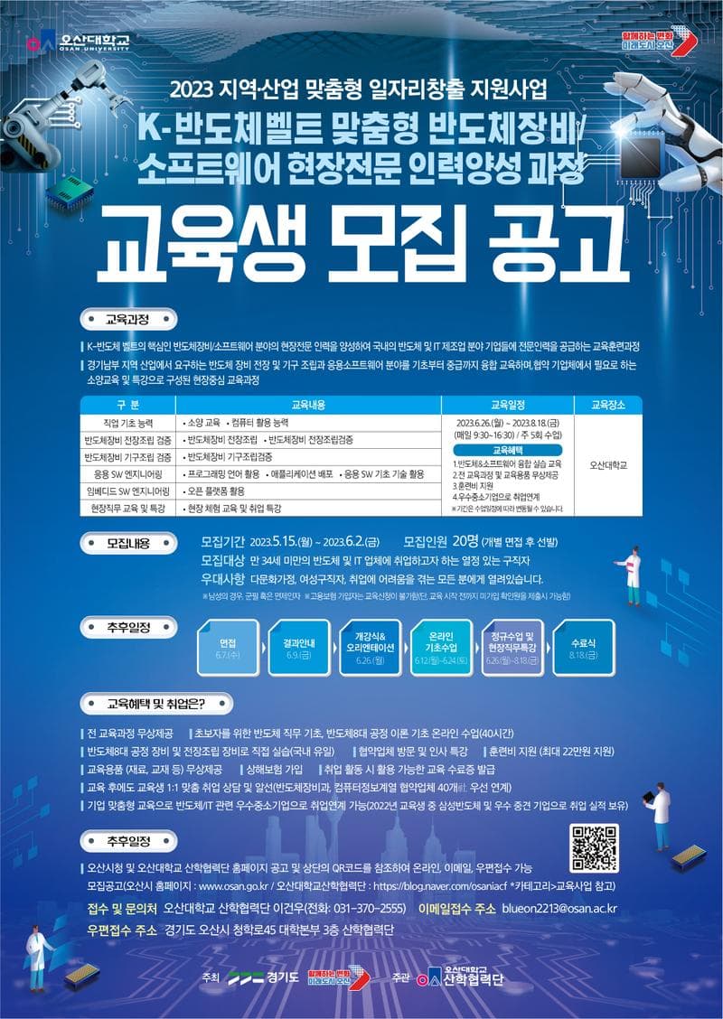 6. 접수방법 - 오산시청 및 오산대학 산학협력단 홈페이지 공고 하단의 첨부파일 또는 QR코드를 참조하여 온라인, 이메일, 우편접수 가능 - 모집공고 (오산시 홈페이지 : www.osan.go.kr / 오산대학교산학협력단 : https://blog.naver.com/osaniacf *카테고리>교육사업 참고 ) - 접수 및 문의처 : 오산대학교 산학협력단 이건우(전화: 031-370-2555) - 이메일접수 주소 : blueon2213@osan.ac.kr - 우편접수 주소 : 경기도 오산시 청학로 45 대학본부 3층 산학협력단 주최 : 경기도, 오산시 주관 : 오산대학교 산학협력단
