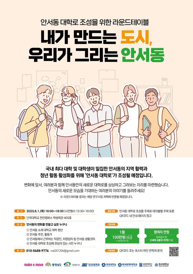 국내 최다 대학 및 대학생이 밀집한 안서동에 지역 활력과 청년 활동 활성화를 위해 '안서동 대학로'가 조성될 예정입니다👀✨ 변화에 앞서, 여러분과 함께 안서동만의 대학로를 그려보는 자리를 마련했습니다.