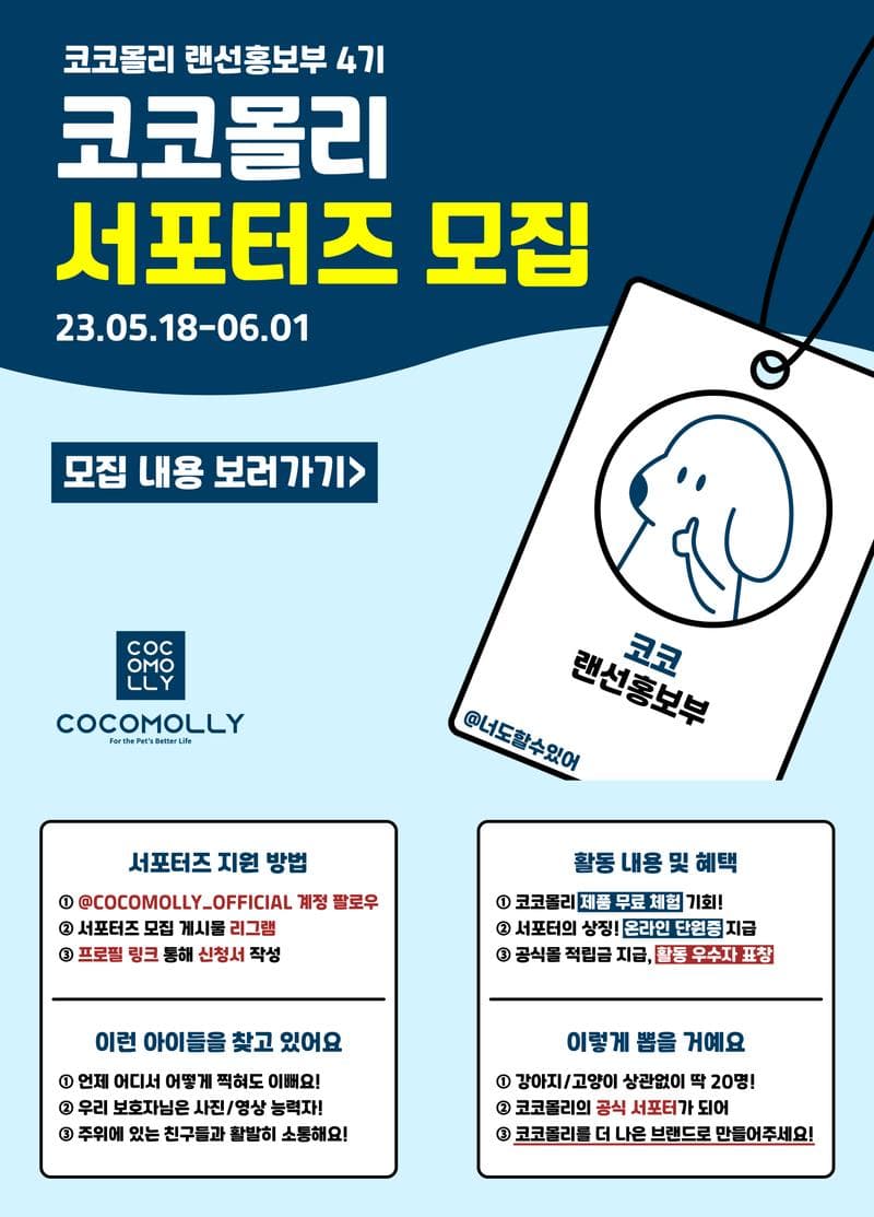 저희 코코몰리의 공식 서포터가 되어, 반려동물 친구들의 행복을 위해 더욱 더 힘써서 앞장서는 브랜드로 만들어 줄 분들을 모집하기 위해 이렇게 왔는데요.