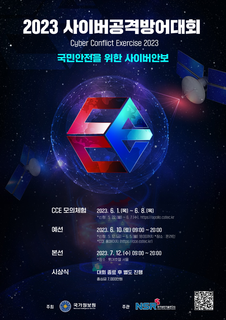 2023 사이버공격방어대회(Cyber Conflict Exercise 2023) ※ 주제 : 국민안전을 위한 사이버안보(Cybersecurity for Public Safety) ㅇ주최/주관 국가정보원 / 국가보안기술연구소 ㅇ참가자격 국민안전을 위한 사이버안보 활동에 관심이 있는 청소년 이상의 대한민국 국민 누구나 *개인 또는 단체(4인 이하)로 참여 가능