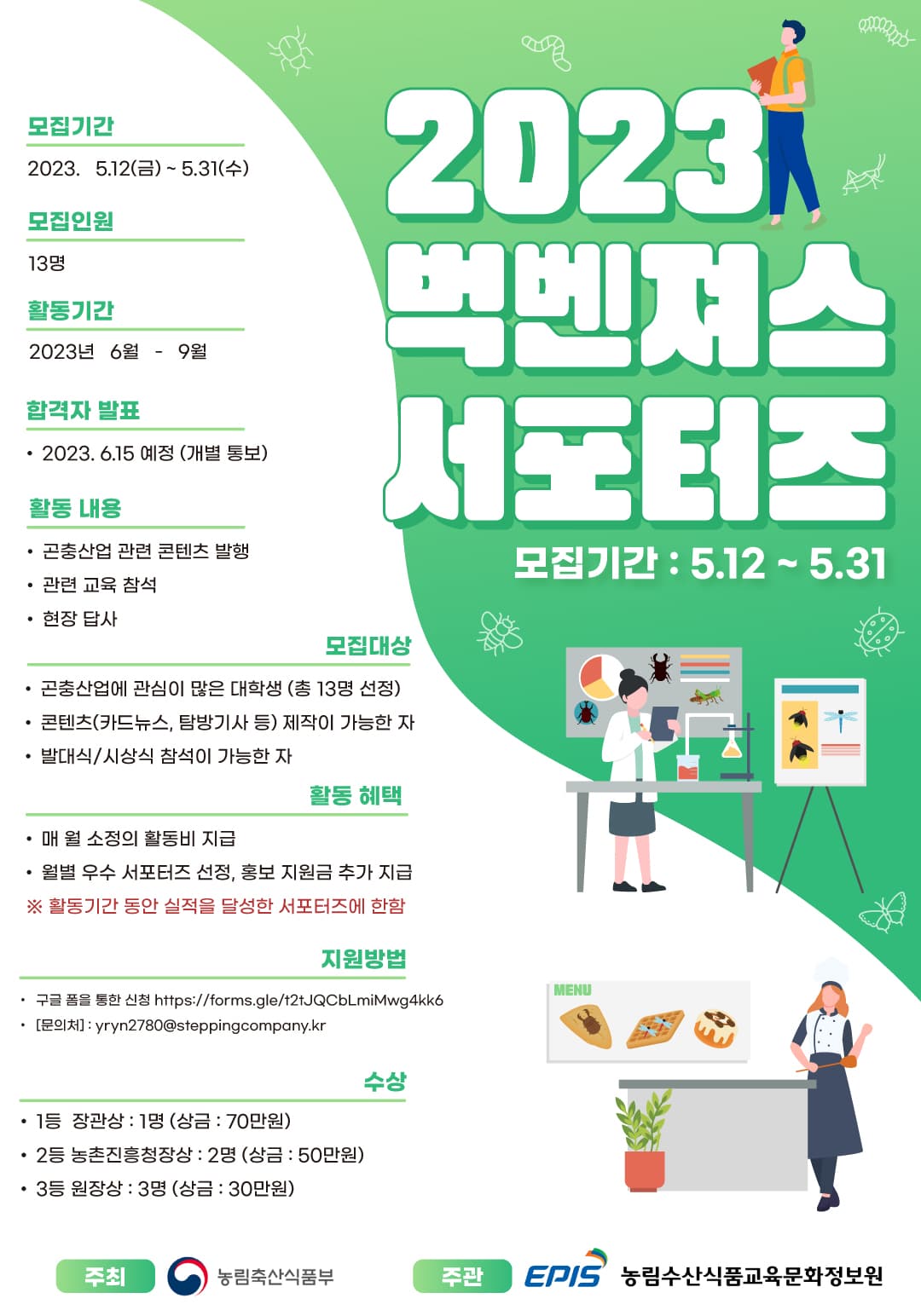 2023 농정원 곤충산업 서포터즈 1기 모집 ✅ 모집 기간 : 2023. 5. 12 (금) \~ 5. 31 (수) ✅ 모집 인원 : 13명 ✅ 모집 대상 - 곤충 산업에 관심이 많은 대학생 - 콘텐츠(카드 뉴스\, 탐방 기사 등) 제작이 가능한 자 - 발대식/시상식 참석이 가능한 자 ✅ 활동 기간 - 2023년 6월 - 9월 ✅ 활동 내용 - 대학생 서포터즈 (1명) + 네이버 블로거 (1명) 팀 구성 예정 (※서포터즈 지원 시 개인이 아닌, 팀으로 지원할 경우 팀 당 '네이버 블로거' 1명씩 배치될 예정) - 예상 주제 : 식용/사료/반려/양잠 ▶ 각 분야에 해당하는 팀 균등 선정 (분야별 3팀) - 곤충 산업 관련 콘텐츠 발행 - 관련 교육 참석 - 현장 답사 ✅ 활동 혜택 - 매 월 소정의 활동비 지급 - 월별 우수 서포터즈 선정\, 홍보 지원금 추가 지급 (※활동 기간 동안 실적을 달성한 서포터즈에 한함.) - 활동 종료 후 시상식에서 우수 서포터즈 선발 (6명) 🎁 농정원장 표창 수여 🎁 ↳ 장관상 (1명) - 상금 70만원 ↳ 농촌진흥청장상 (2명) - 상금 50만원 ↳ 원장상 (3명) - 상금 30만원 ✅ 합격자 발표 - 2023. 06. 15 예정 (개별 통보)