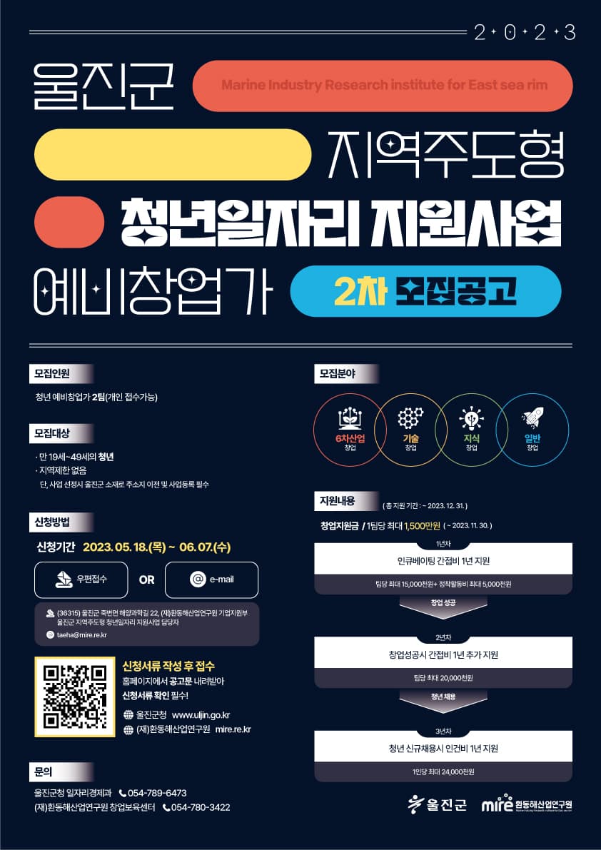──────────────────────────── 신청 기간 2023. 05. 18. (목) \~ 06. 07. (수) 신청 방법 1) 포스터 내 큐알코드를 스캔하거나 홈페이지를 방문하여 공고문 확인 및 신청서를 다운로드해 주세요 ▶울진군청 www.uljin.go.kr / ▶(재)환동해산업연구원 mire.re.kr 2) 다운로드한 신청서를 모두 작성한 후 다음과 같은 방법으로 접수를 진행해 주세요 3-1) 우편 접수 [36315] 울진군 죽변면 해양과학길 22, (재)환동해산연구원 기업지원부 울진군 지역주도형 청년일자리 지원사업 담당자 or 3-2) 이메일 접수 taeha@mire.re.kr ──────────────────────────── 문의 사항 ▶울진군청 일자리경제과 ☎ 054-789-6473 ▶(재)환동해산업연구원 창업보육센터 ☎ 054-780-3422