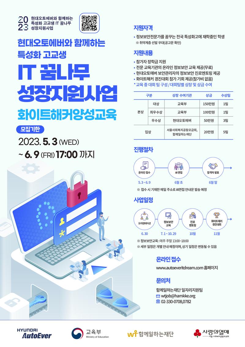 ○ 사업일정 1) 모집기간 : 2023년 5월 3일(수) \~ 2023년 6월 9일(금) 17시까지 2) AI면접 : 2022년 6월초 3) 결과발표/OT : 2023년 6월 30(금) 4) 정보보안교육 : 2023년 7월 1일(토) \~ 2023년 10월 29일(일) 5) 진로멘토링 : 10월 중 6) 화이트해커 경진대회 : 11월 중 ※ 일정은 상황에 따라 변동 될 수 있습니다.