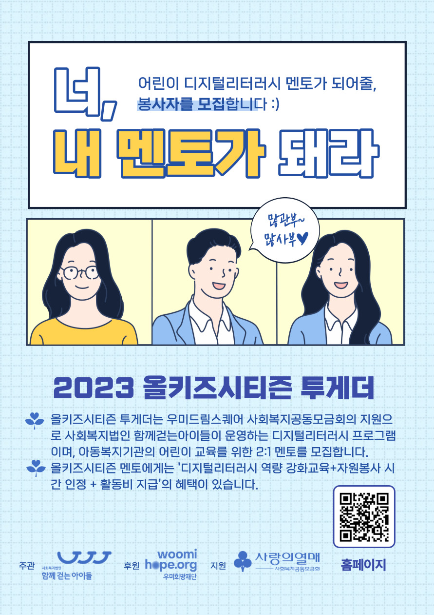 ○ 모집개요 「함께걷는아이들」은 사회적 관심과 지지가 필요한 어린이·청소년의 정서적 안정 및 교육 양극화 해소를 통해 건강한 사회구성원으로서의 성장을 목표로 교육, 문화예술, 정서, 자립 등의 통합적 복지사업을 기획, 운영하는 비영리 사회복지법인입니다. 함께걷는아이들은 디지털 세대인 어린이가 디지털 환경에서 안전하고 건강하게 생활하며 디지털 시민으로서의 역량을 키워나갈 수 있도록 디지털리터러시 교육 경험을 지원하는 '올키즈시티즌 투게더' 프로그램을 진행합니다. 2023년 올키즈시티즌 투게더 프로그램에 함께할 '멘토'를 모집하오니 많은 관심과 지원 바랍니다.