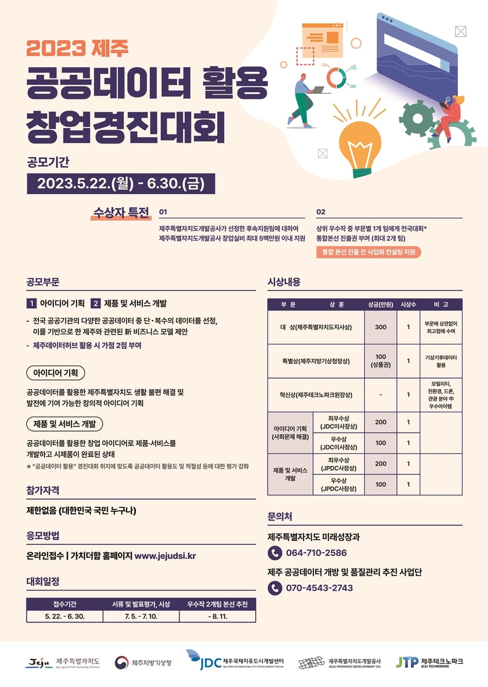 2023년 제주 공공데이터 활용 창업경진대회 공공데이터를 활용한 창업아이디어 및 창의적인 비즈니스 모델을 발굴하고 창업지원 및 육성을 통해 공공데이터 이용 활성화 및 창업 촉진