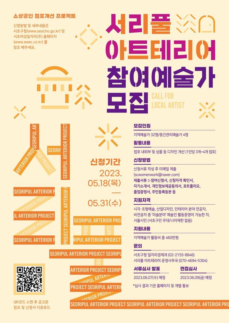 1. 사업명 : 2023년 서리풀 아트테리어 2. 사업기간 : 2023년 6월\~ 11월 3. 모집인원 : 지역예술가 32명 / 중간관리예술가 4명 4. 활동내용 - 점포 내·외부 및 상품 등 디자인 개선 (1인당 3\~4개 점포) - 직무교육 및 직업역량 배양교육 5. 신청자격 - 시각·조형예술, 산업디자인, 인테리어 분야 전공자 - 비전공자 중 ‘미술분야’예술인 활동증명이 가능한 자 - 서울시민(서초구민 및 서초구 활동 경력 예술가 가점 부여) 6. 신청서류 작성 후 이메일 제출 (scwomenwork@naver.com) 7. 신청서류 ① 참여신청서 ② 사업 참여 자격 확인 동의서 ③ 개인정보 수집·이용·제공 동의서 ④ 주민등록등본 ⑤ 자기소개서 ⑥ 포트폴리오 (·형식:자유, ·파일형태: pdf 형식, ·분량: 10페이지 이하) ⑦ 졸업증명서 8. 신청기간 : 2023. 5. 18.(목) \~ 5. 31.(수) 9. 류심사 발표 : 2023. 6. 7.(수) 예정 10. 면접심사 : 2023. 6. 9(금) 예정 11. 문의 : 서초구청 일자리경제과 (02-2155-8846) 서리풀 아트테리어 운영사무국 (070-4694-5304)