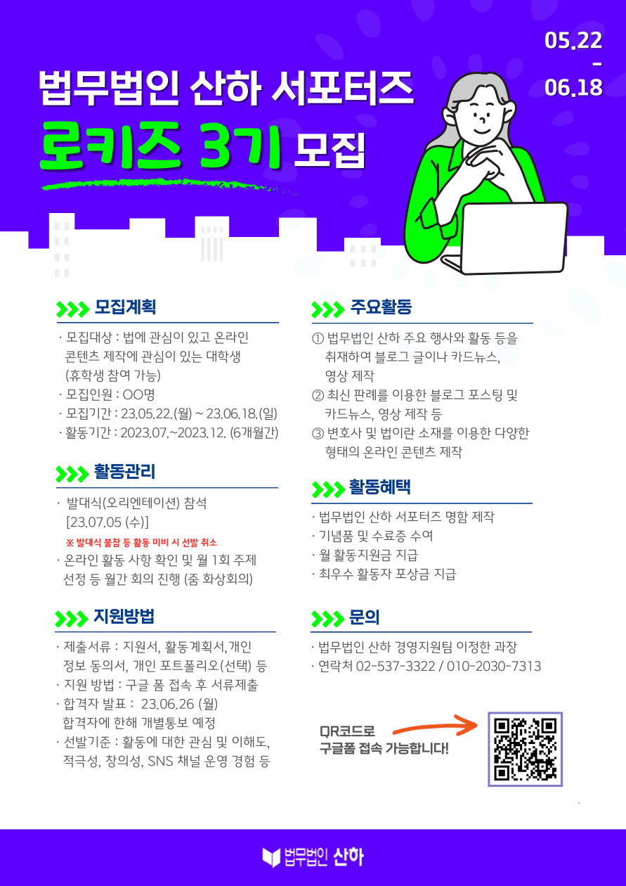 법무법인 산하 서포터즈 로키즈 3기 모집 1. 모집계획 ‧ 모집대상 : 법에 관심이 있고 온라인 콘텐츠 제작에 관심이 있는 대학생(휴학생 참여 가능) ‧ 모집인원 : OO명 ‧ 모집기간 : 23. 05. 22.(월) \~ 23. 06. 18.(일) 2. 운영계획 ‧ 활동기간 : 2023. 07. \~ 2023. 12.(6개월간) ‧ 주요활동 ① 법무법인 산하 주요 행사와 활동 등을 취재하여 블로그 글이나 카드뉴스, 영상 제작 ② 최신 판례를 이용한 블로그 포스팅 및 카드뉴스, 영상 제작 등 ③ 변호사 및 법이란 소재를 이용한 다양한 형태의 온라인 콘텐츠 제작 ※ 산하 페이스북, 인스타그램 및 블로그 계정에 업로드하고 본인 SNS 계정에도 해당 활동 공유 3. 활동관리 ‧ 발대식(오리엔테이션) 참석 (2023. 07. 05. 예정) ※ 발대식 불참 등 활동 미비시 선발 취소될 수 있음 ‧ 온라인 활동 사항 확인 및 월 1회 주제 선정 등 월간 회의 진행 (줌을 이용한 화상회의) 4. 활동혜택 ‧ 법무법인 산하 서포터즈 명함 제작, 기념품 및 수료증 수여 ‧ 월 활동지원금 지급, 최우수 활동자 포상금 지급 5. 지원방법 ‧ 제출서류 : 지원서, 활동계획서, 개인정보동의서, 개인 포트폴리오(선택) 등 ‧ 지원방법 : 구글폼 링크(https://forms.gle/czawf5kvMPLPHp1W6) 접속 후 위 제출서류 제출 ‧ 선발기준 : 활동에 대한 관심 및 이해도, 적극성, 창의성, SNS 채널 운영 경험 등 ‧ 결과발표 : 2023. 06. 26. 예정 (합격자에 한해 개별 통보) 6. 문의 ‧ 법무법인 산하 경영지원팀 이정한 과장 ‧ 연락처 : 02-537-3322 / 010-2030-7313