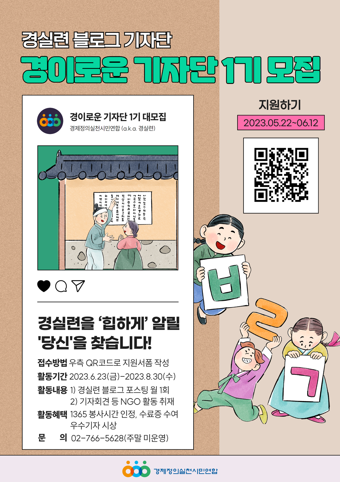 ▶ 모집 과정을 알고 싶다면! ‧모집대상: NGO 활동에 관심있는 2030 청년 누구나 ‧모집기간: 2023년 5월 22일(월) \~ 2023년 6월 12일(월), 21일간 ‧모집인원: 6명 내외 ‧1차발표: 2023년 6월 14일(수) ‧전화면접: 2023년 6월 15일(목) \~ 6월 16일(금) ‧최종발표: 2023년 6월 19일(월), 개별연락 ‧활동기간: 2023년 6월 23일(금) \~ 2023년 8월 30일(수) ‧활동내용: 경실련 활동과 연계한 기사를 월 1회 작성, 기자회견 토론회 등 NGO 활동 취재 ‧활동혜택: 1365 봉사시간 인정, 수료증 수여, 우수기자 시상 ‧신청방법: https://bit.ly/wonder1st